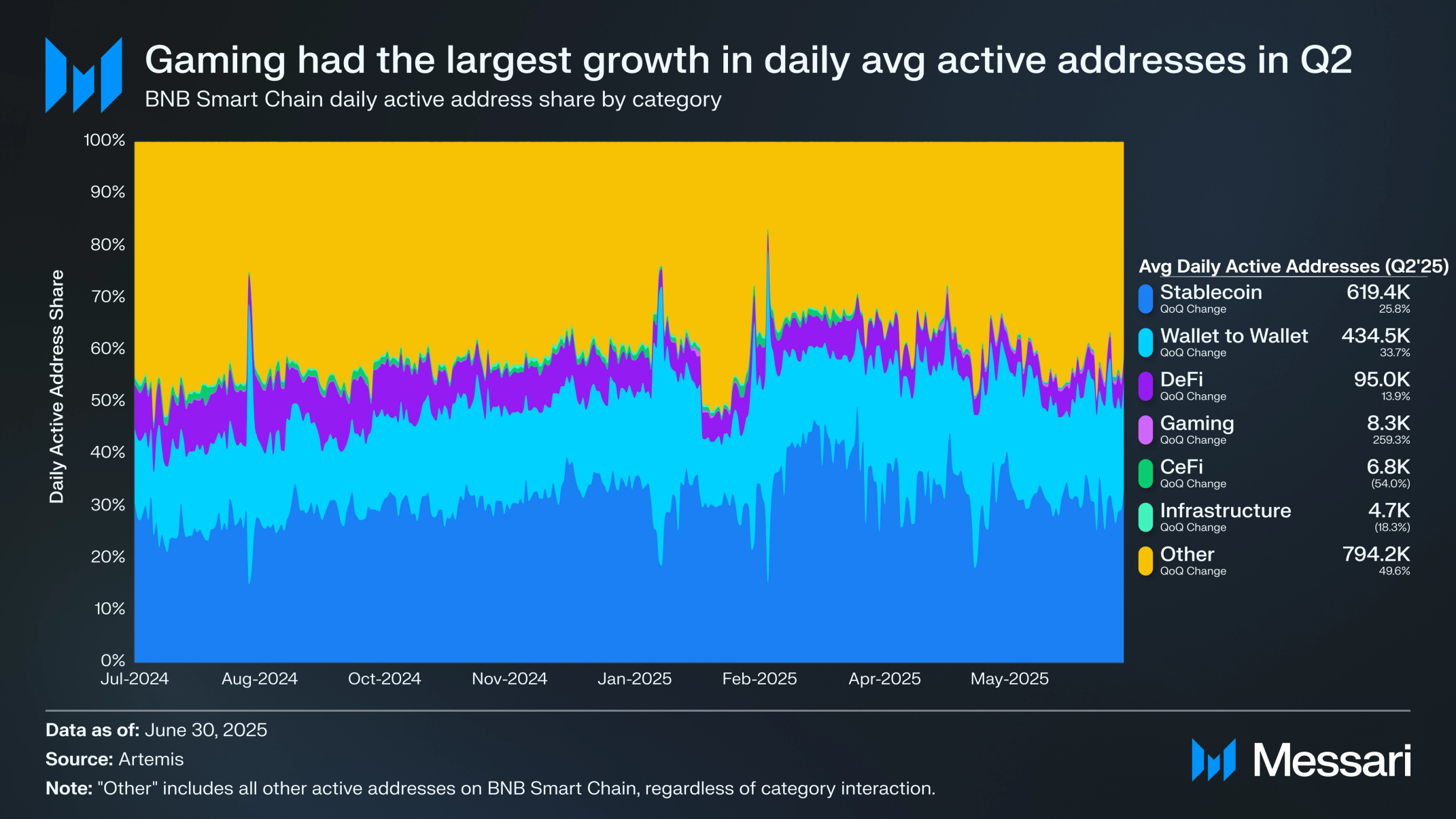 • 일일 활성 주소와 거래량은 바이낸스 알파(Binance Alpha) 캠페인에 힘입어 전분기 대비 각각 33.2%와 101.9% 증가했다. "기타" 카테고리는 173.7% 증가하여 게임화된 비표준 활동을 반영했다.