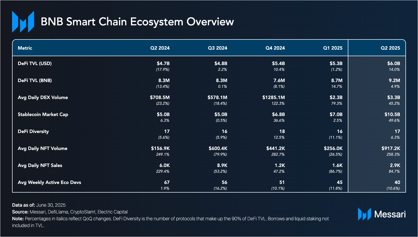 생태계에서는 디파이 TVL이 전분기 대비 14.0% 성장했으며, 이는 새로운 유동성과 리스타다오를 통한 리퀴드 스테이킹의 확장에 의해 지원되었다. BNB 스마트 체인은 또한 일일 거래량 평균 33억 달러를 기록하며 덱스 거래량에서 1위 자리를 되찾았고, 스테이블코인 시가총액은 USD1의 출시와 0-Fee 카니발 같은 인센티브 메커니즘에 힘입어 전분기 대비 49.6% 상승하여 105억 달러에 도달했다. NFT 활동이 강하게 반등했고, opBNB는 4월의 볼타 업그레이드에서 도입된 서브초 블록 생성으로 계속 확장했다.