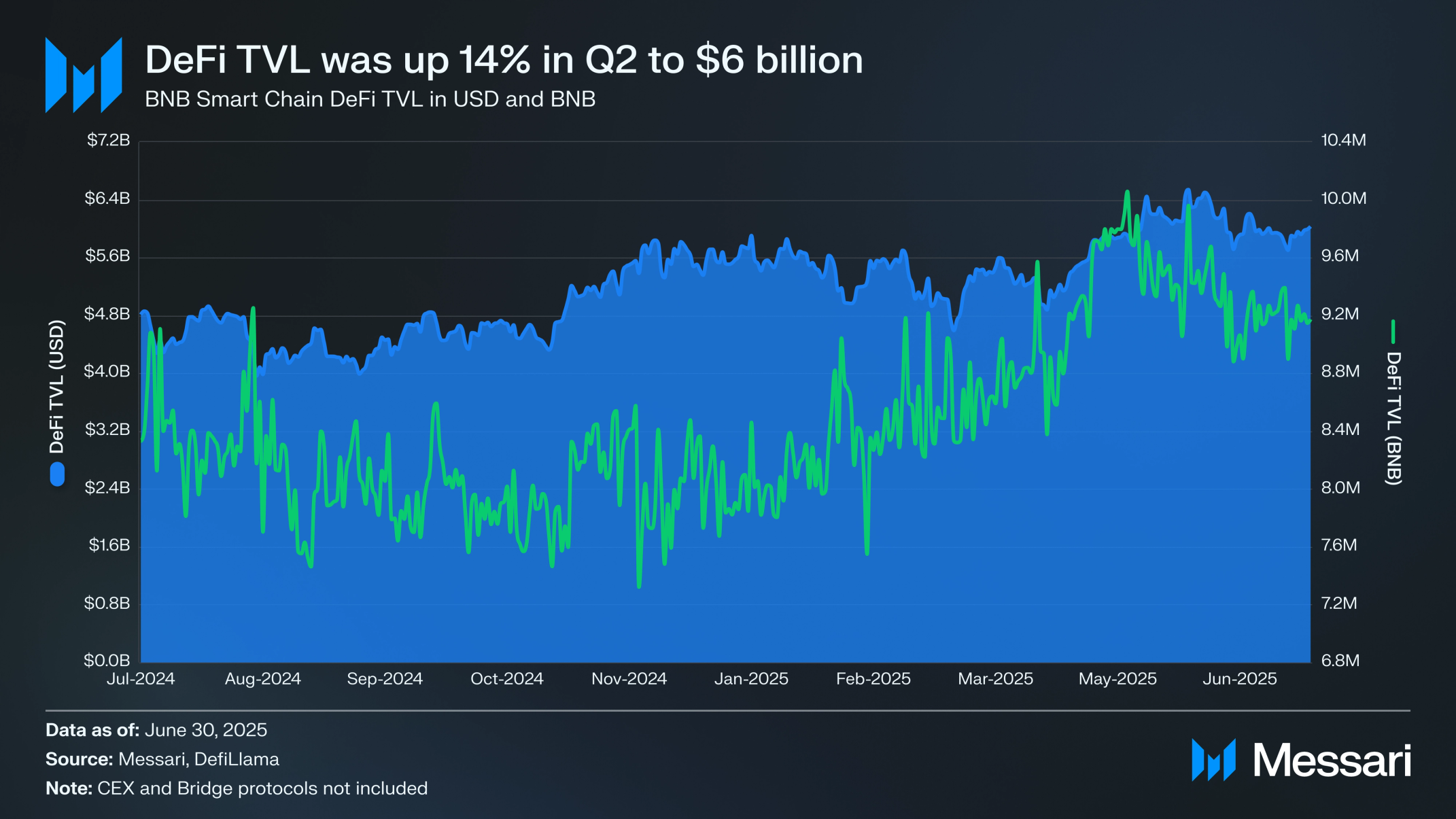 BNB 스마트 체인의 디파이 생태계는 2025년 2분기에 계속 성장했으며, TVL이 전분기 대비 14.0% 상승하여 1분기 53억 달러에서 60억 달러에 도달했다. BNB 기준으로, TVL은 전분기 대비 4.9% 증가하여 870만 BNB에서 920만 BNB로 상승했다. 미국 달러와 BNB 표시 TVL 모두의 상승은 긍정적인 시장 성과와 증가한 온체인 활동의 조합을 반영한다.