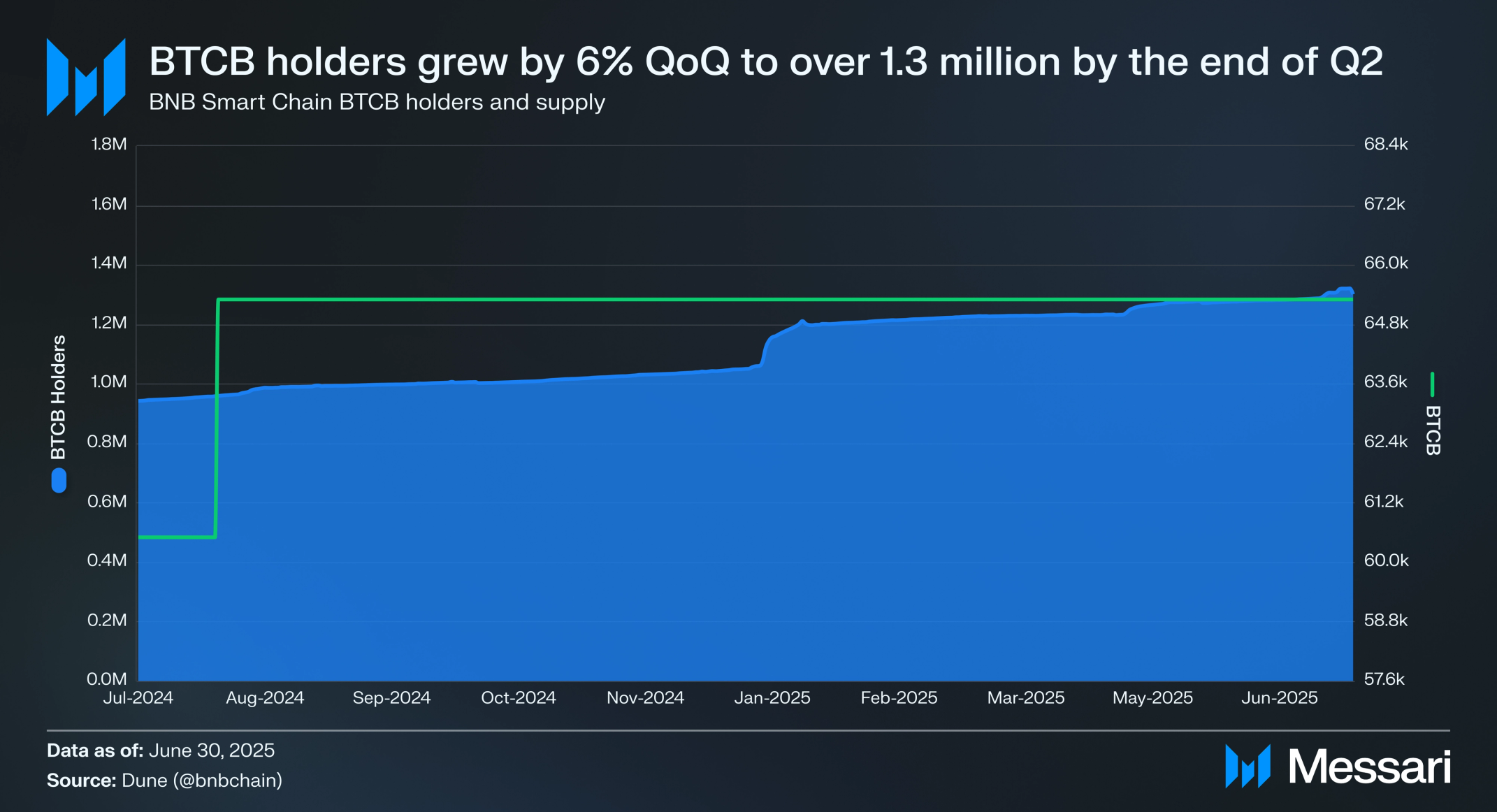 BTCB는 BNB와 스테이블코인을 제외하고 BNB 스마트 체인에서 시가총액 기준으로 가장 큰 자산 중 하나다. 이는 BNB 스마트 체인에서 비트코인의 토큰화된 버전이다. 2분기 BTCB 공급량은 전분기 대비 변화 없이 65,300개였다. BTCB 보유자들의 경우, 전분기 대비 6% 증가하여 130만 명을 기록했다. BNB 스마트 체인은 새로운 BTCFi 생태계에 의해 강화되었다. 솔브 파이낸스(Solv Finance), 로렌조(Lorenzo), 롬바드 파이낸스(Lombard Finance) 등의 프로젝트들은 BNB 스마트 체인의 BTCB 보유자들에게 다양한 디파이 기회에 참여할 수 있는 기회를 제공한다.