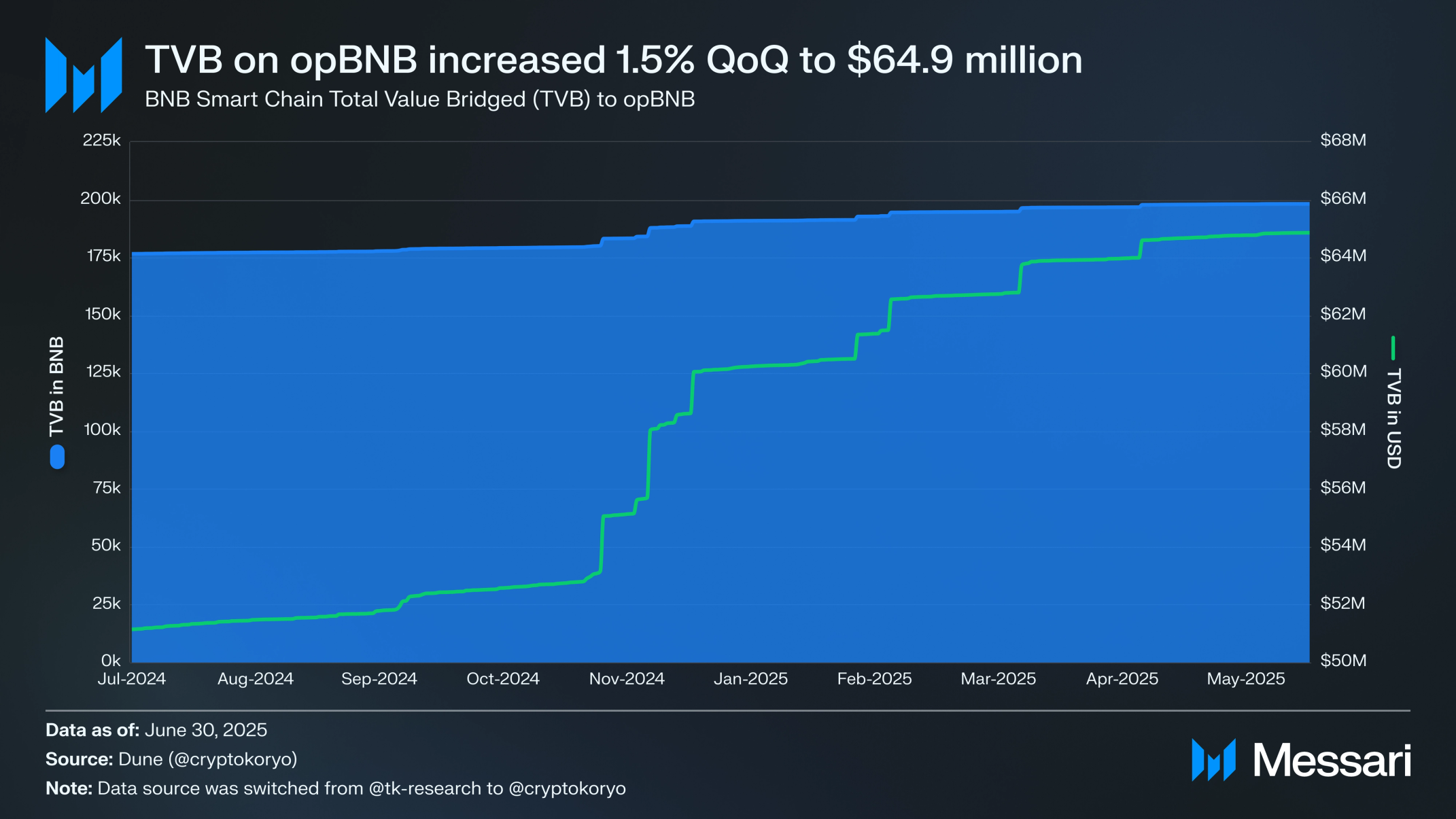 BNB 스마트 체인의 실행을 확장하도록 설계된 EVM 호환 옵티미스틱 롤업인 opBNB는 2025년 2분기 동안 브릿지된 가치에서 완만한 성장을 계속 보였다. opBNB로의 총 브릿지 가치(TVB)는 미국 달러 기준으로 전분기 대비 1.5% 증가하여 6,490만 달러에 도달했다. BNB 기준으로, TVB는 전분기 대비 0.8% 상승하여 198,200 BNB를 기록했다.