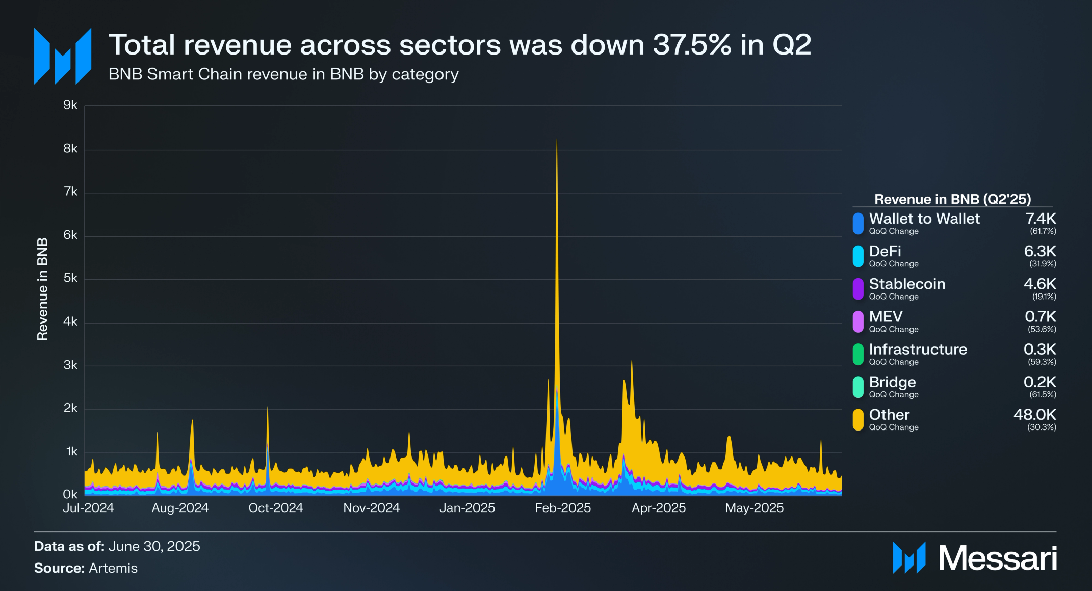 지갑 간 거래는 가장 큰 하락을 보여 전분기 대비 61.7% 감소하여 7,375.6 BNB를 기록했고, 총 시장 점유율의 10.9%만을 차지했다(전분기 대비 40% 감소). 수수료 생성 측면에서 두 번째로 큰 카테고리는 디파이로, 전분기 대비 31.9% 감소하여 6,338.6 BNB를 기록했고 총 수수료의 9.4%를 차지했다. 스테이블코인은 3위를 차지하여 4,646.9 BNB(전분기 대비 19.1% 감소)를 생성했고 총 수수료의 6.9%를 차지했다. MEV(전분기 대비 53.6% 감소하여 749.5 BNB), 인프라(전분기 대비 59.3% 감소하여 268.6 BNB), 브릿지(전분기 대비 61.5% 감소하여 161.4 BNB) 모두 감소를 보였다. 총 수익의 71.1%를 차지하는 모든 기타 카테고리들은 전분기 대비 30.3% 감소하여 48,000 BNB 바로 아래를 생성했다.