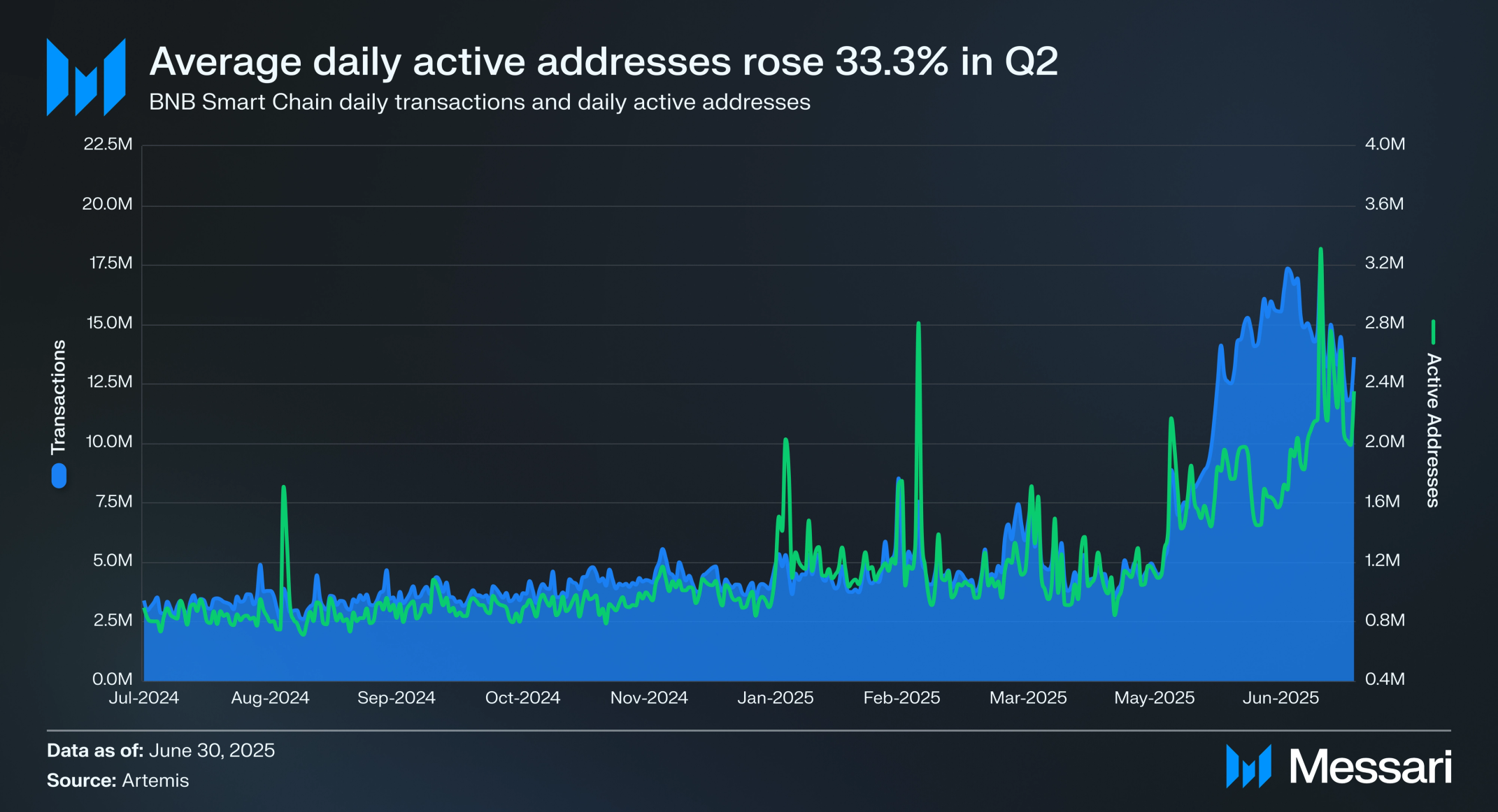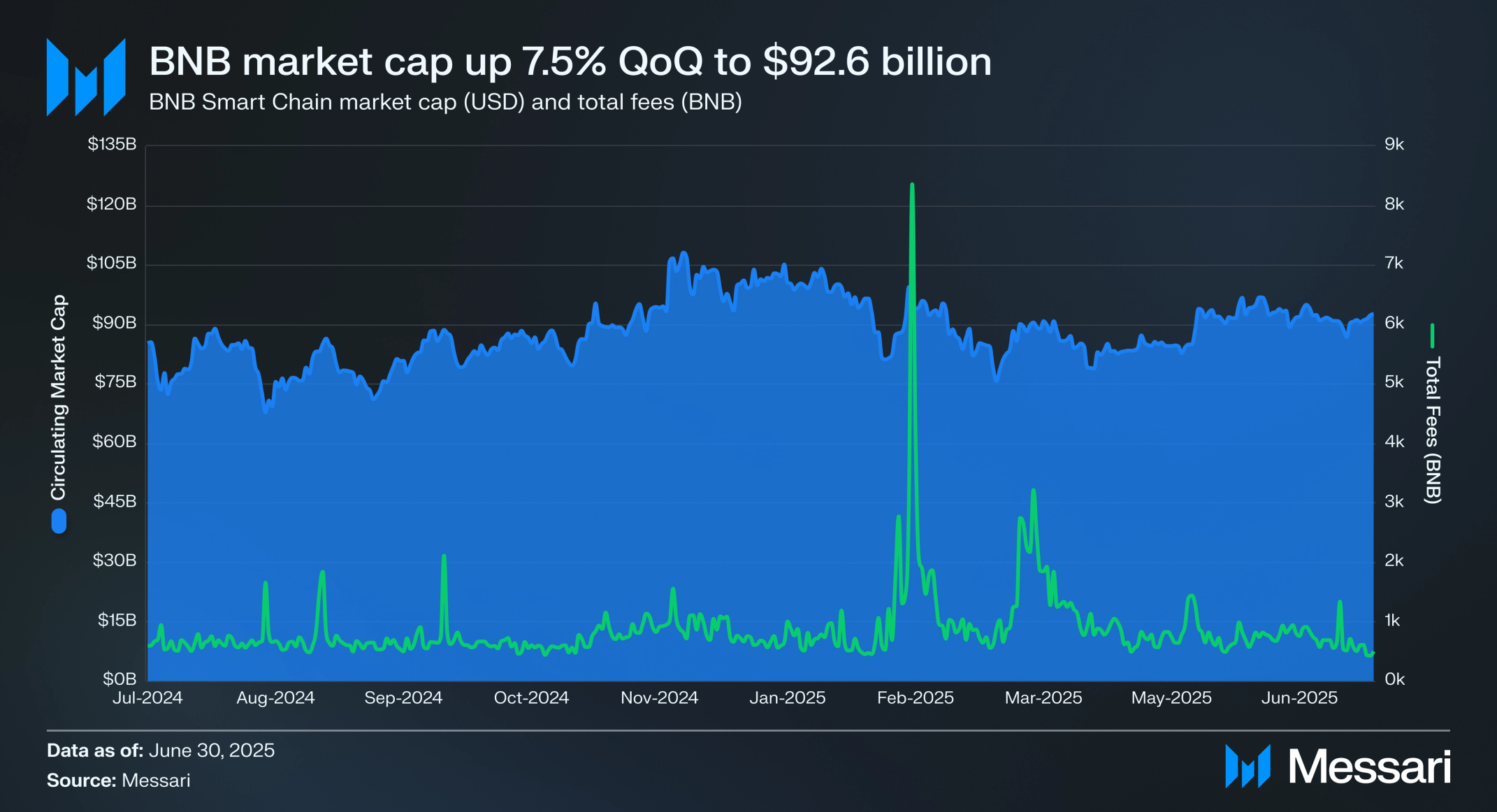 BNB의 시가총액은 2분기 말까지 전분기 대비 7.5% 증가하여 926억 달러에 도달했으며, 1분기 하락에서 회복했다. BNB 가치평가의 완만한 반등은 유동성 긴축과 거시 불확실성에 대응하여 시장 참가자들이 위험을 재조정하면서 전반적으로 엇갈린 자산 성과를 보인 분기에 이루어졌다. 2024년 4분기 최고치로 돌아오지는 않았지만, BNB의 상대적 회복력은 체인의 로드맵 실행과 장기 포지셔닝에 대한 투자자 신뢰 증가를 시사한다.