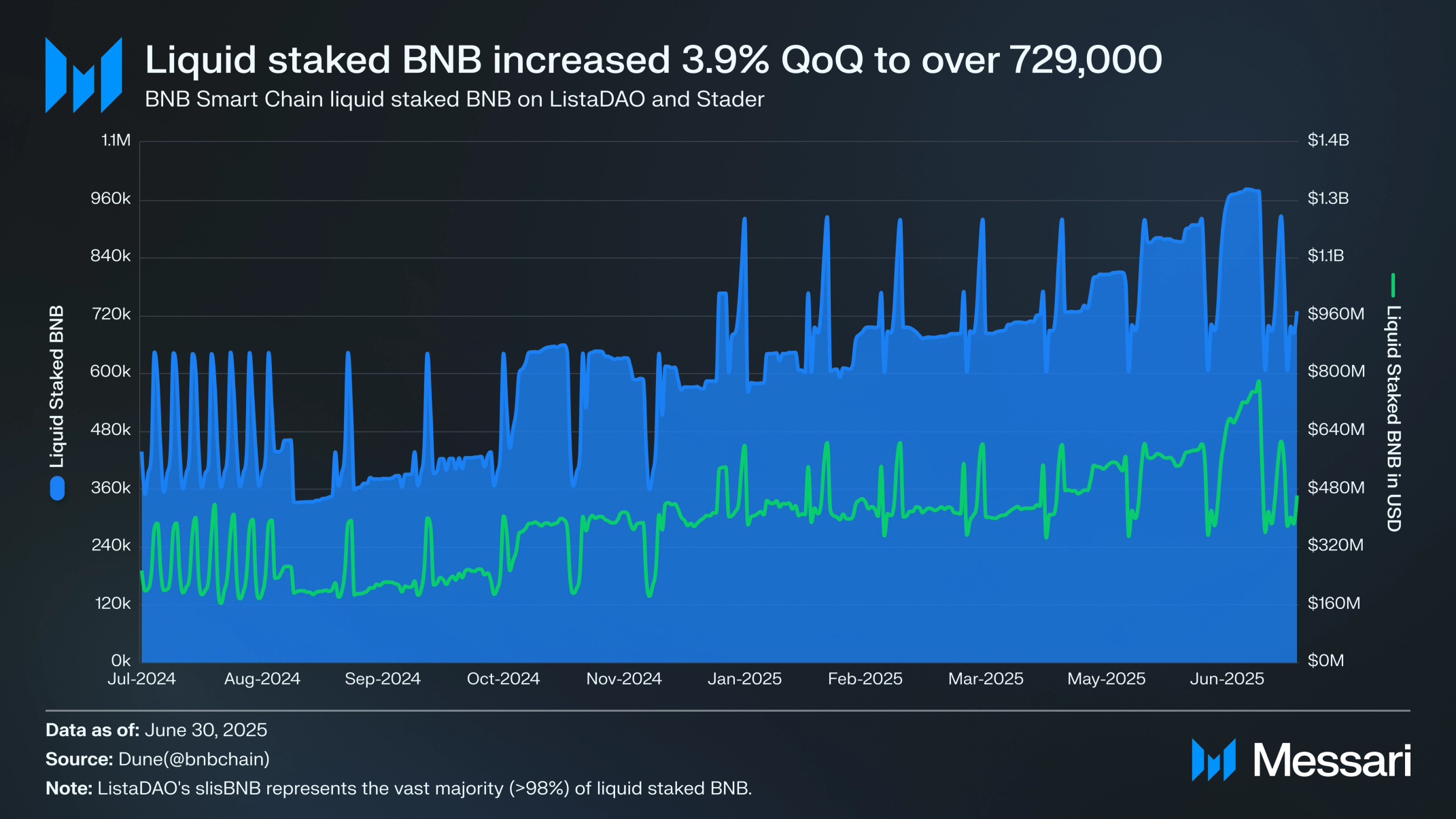 지난해 검증과 스테이킹 서비스가 BNB 스마트 체인으로 이관되면서, 리퀴드 스테이킹은 BNB 체인 생태계의 최우선 과제가 되었다. 동시에, 리스타다오의 리퀴드 스테이킹 솔루션인 slisBNB가 BNB 스마트 체인에서 지배적인 리퀴드 스테이킹 솔루션으로 부상했다. 2분기 말까지, 729,100 BNB(4억 6,230만 달러)가 리퀴드 스테이킹 솔루션에 예치되었다. 이는 1분기 말 701,200개에서 리퀴드 스테이킹된 BNB가 전분기 대비 3.9% 증가한 것을 나타낸다.