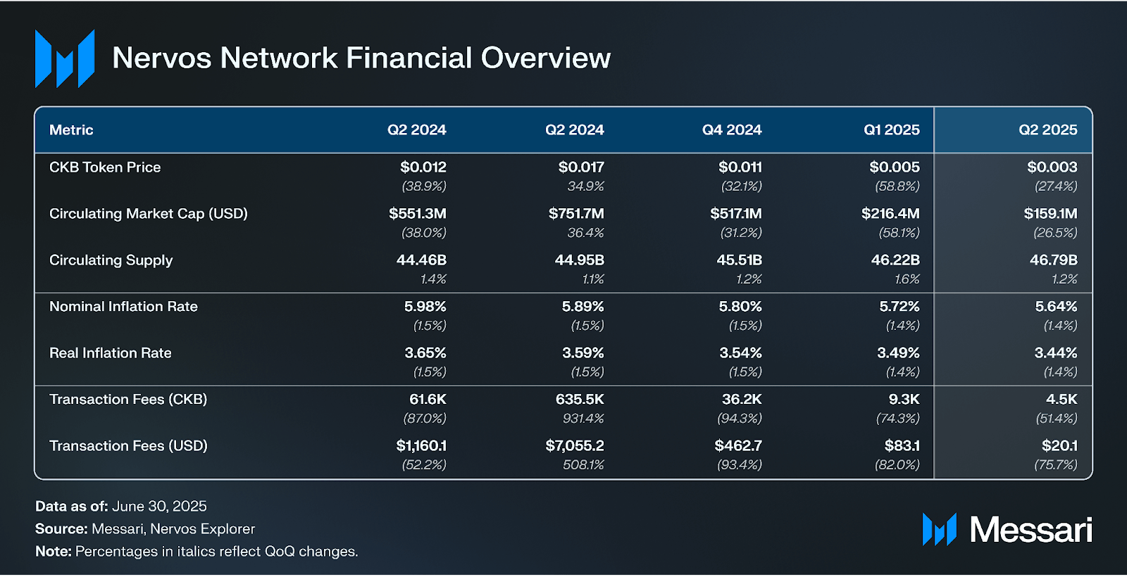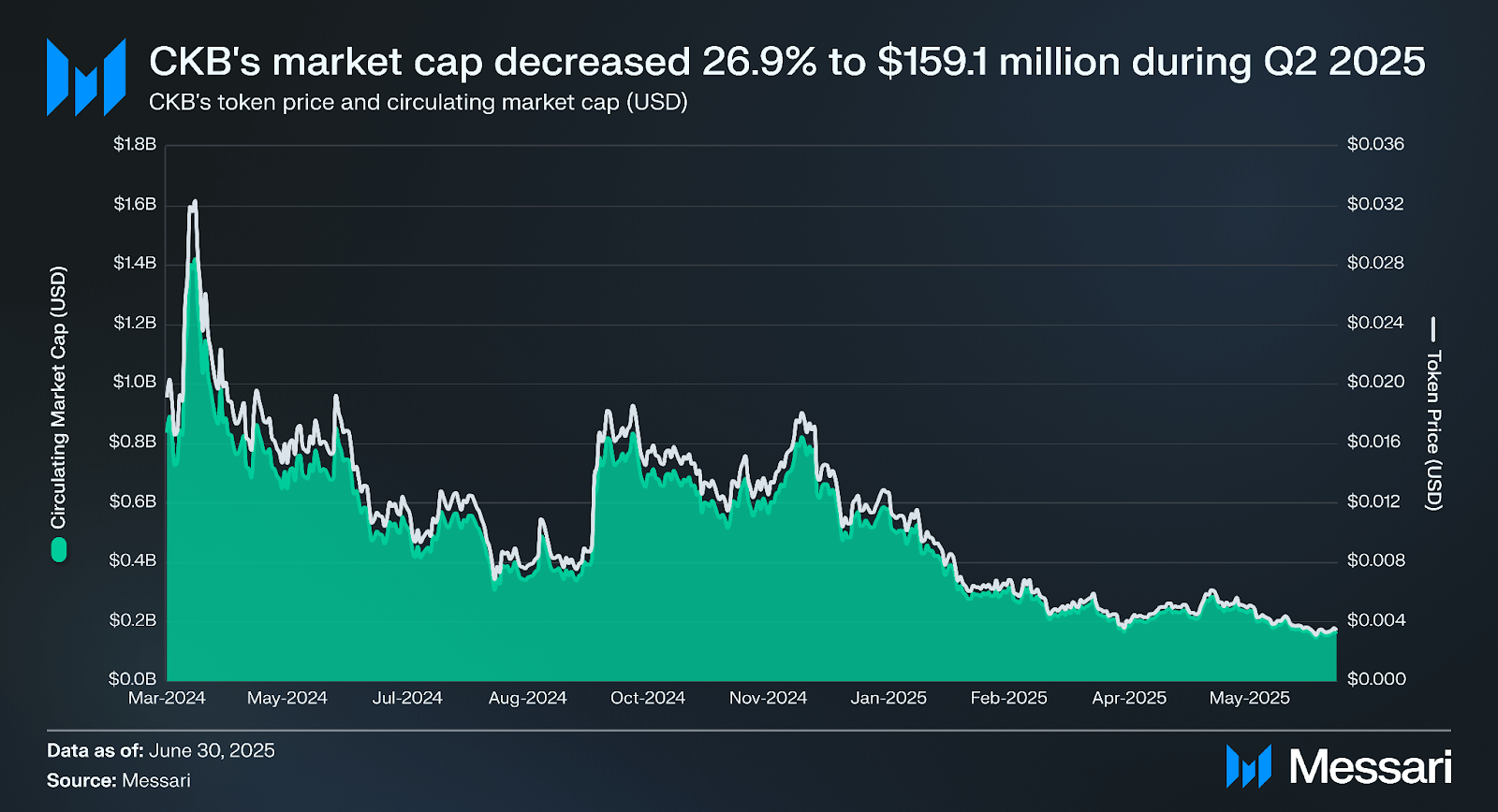 CKB의 가격은 2025년 2분기에 전분기 대비 27.4% 하락하여 0.005달러에서 0.003달러로 떨어졌다. 유통 공급량은 1.2% 증가하여 468억 개가 되었고, 그 결과 유통 시가총액은 26.5% 감소하여 1억 5,910만 달러를 기록했다. CKB의 시가총액 순위는 165위에서 242위로 증가하여 더 넓은 시장 대비 저조한 성과를 나타냈다.