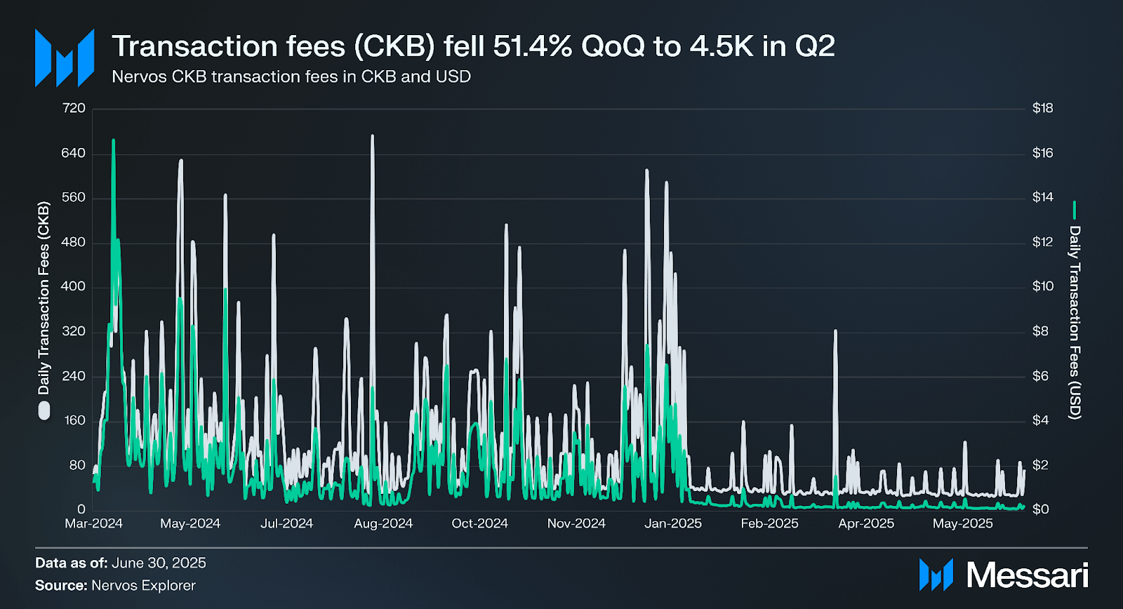 거래 수수료는 2025년 2분기에 전분기 대비 51.4% 감소하여 4,500 CKB를 기록했다. CKB 기준 평균 일일 수수료는 97에서 40으로 전분기 대비 58.5% 하락했다. 너보스 CKB에서 거래 수수료는 CKB로 지불되며 네트워크의 2차 발행에서 나오는 블록 보상과 함께 마이너들에게 분배된다.