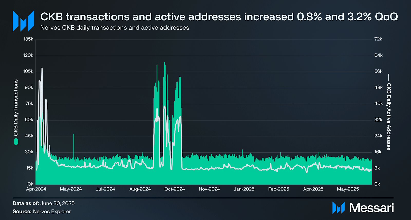 너보스 CKB의 활동은 2025년 2분기에 적당히 증가했다. 총 거래는 전분기 대비 0.8% 증가하여 230만 건을 기록했고, 활성 주소는 3.2% 증가하여 775,800개를 기록했다. 평균 일일 활성 주소 수도 전분기 대비 2% 증가하여 8,500개를 기록했다.