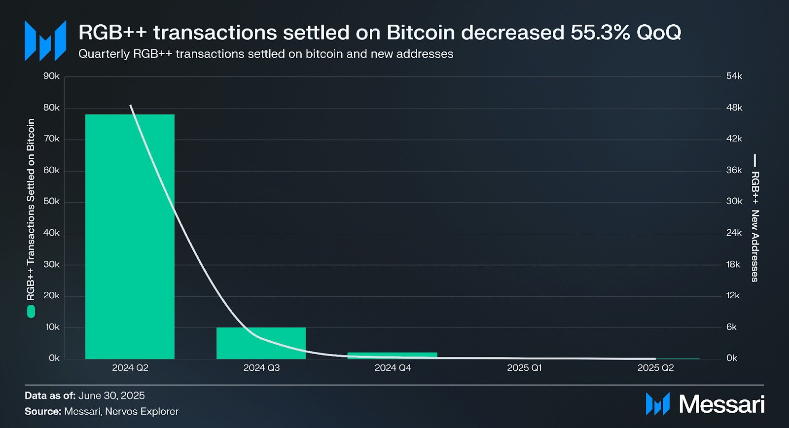 2025년 2분기에 RGB++의 사용량은 계속 감소했다. 총 거래 수는 전분기 대비 55.3% 감소하여 195건을 기록했다. 또한 총 새로 매핑된 비트코인 주소는 전분기 대비 74% 감소하여 32개를 기록했다. 하지만 RGB++에서 새로운 자산 생성은 전분기 대비 4.7% 증가하여 623개를 기록하며 약간의 상승세를 보였다.