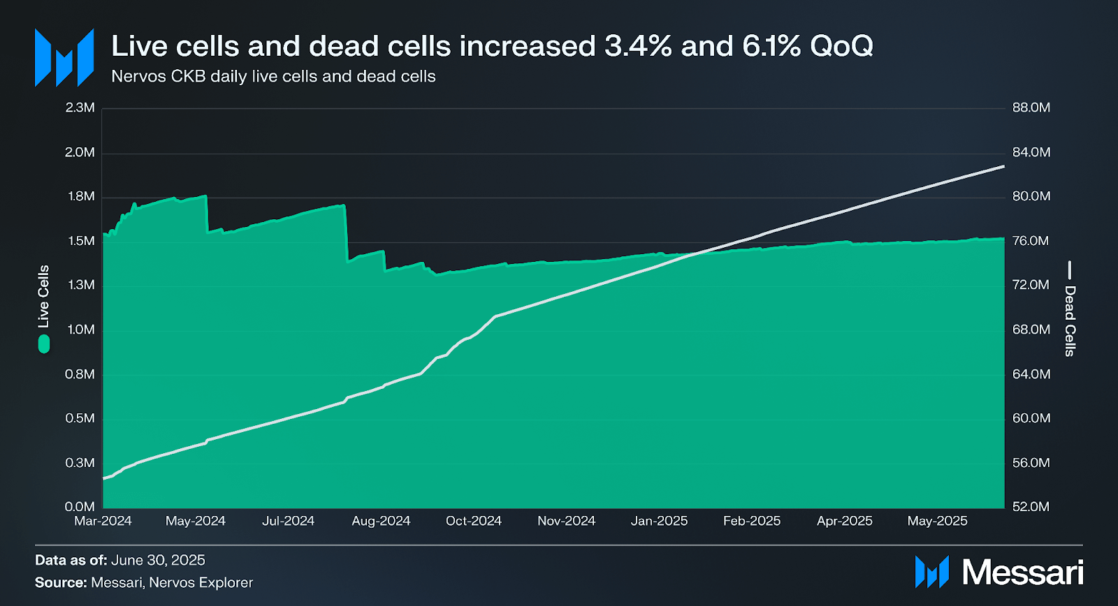 너보스 CKB의 셀 활동은 2025년 2분기에 증가했다. 평균 일일 라이브 셀 수는 전분기 대비 3.4% 증가하여 150만 개를 기록했으며, 2025년 1분기부터의 성장을 지속했다. 총 데드 셀도 증가하여 전분기 대비 6.1% 증가한 8,060만 개를 기록했다.