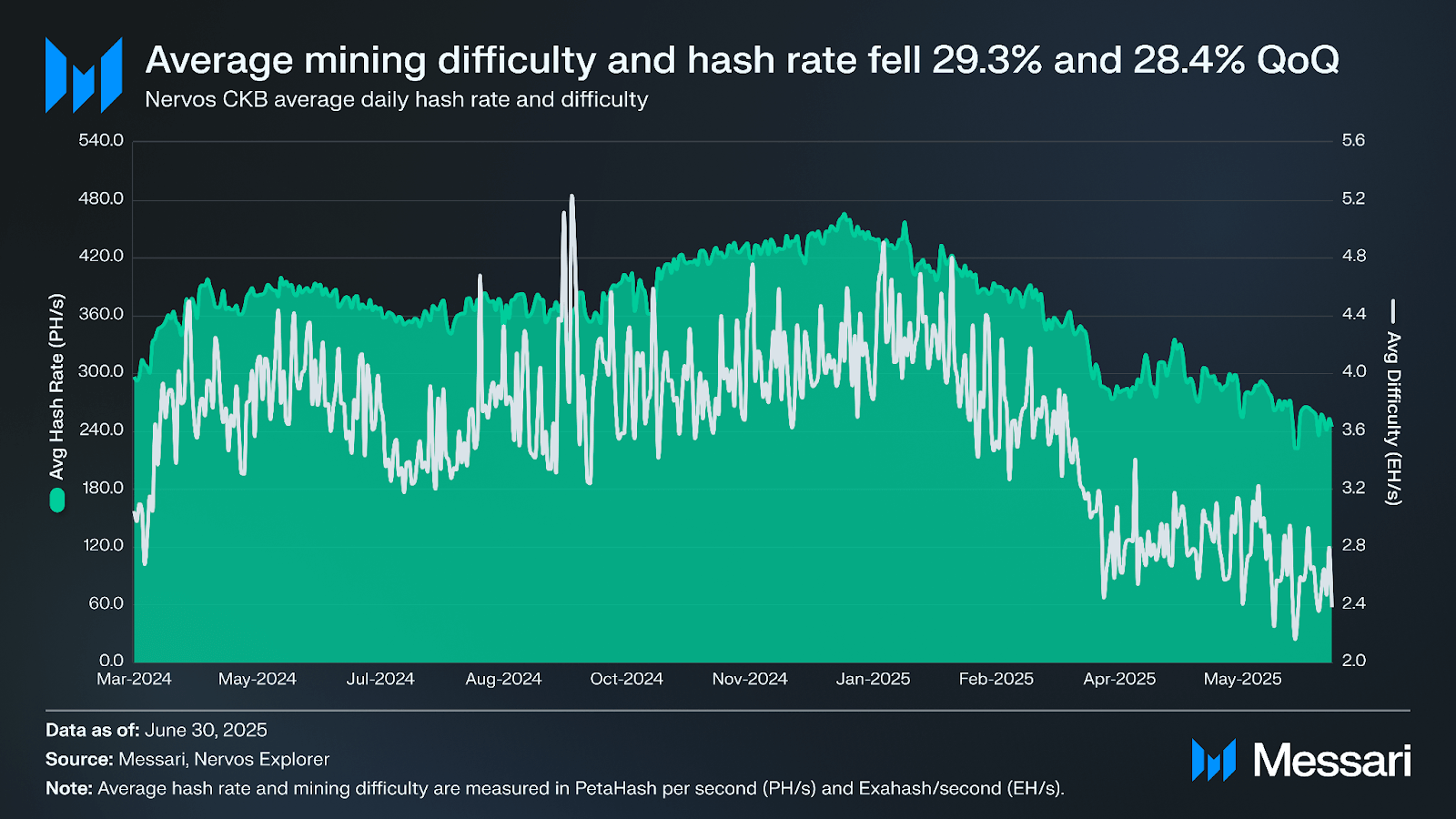 2025년 2분기에 너보스 CKB의 평균 해시레이트는 전분기 대비 28.4% 감소하여 282.6 PH/s를 기록했다. 마이닝 난이도도 감소하여 전분기 대비 29.3% 하락한 2.8 EH/s를 기록했다.