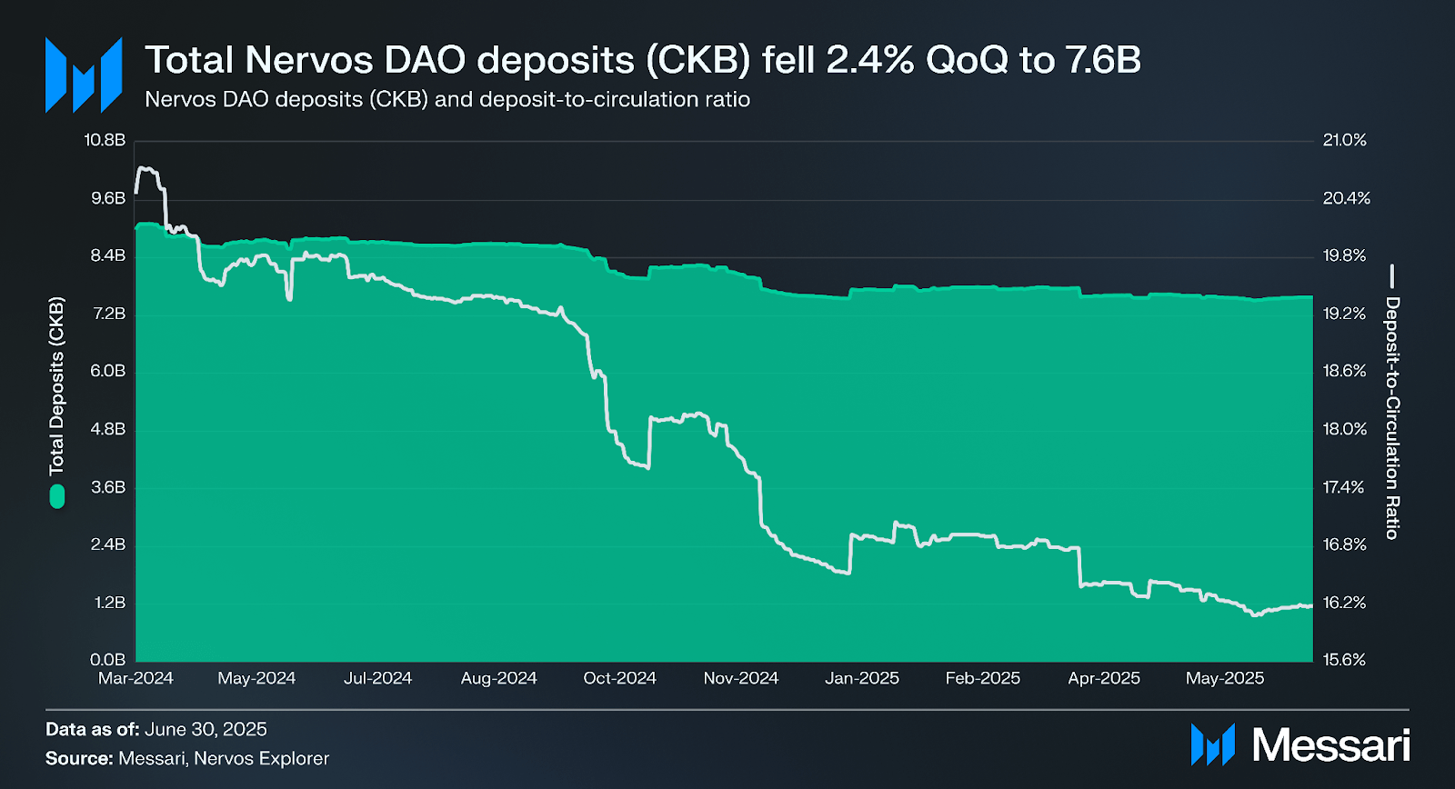 너보스 DAO의 총 예치금은 2025년 2분기 말까지 전분기 대비 2.4% 감소하여 76억 CKB를 기록했다. 너보스 DAO 예치금과 CKB의 유통 공급량 간의 비율을 추적하는 예치-유통 비율은 6월 말까지 16.2%로 하락했다.