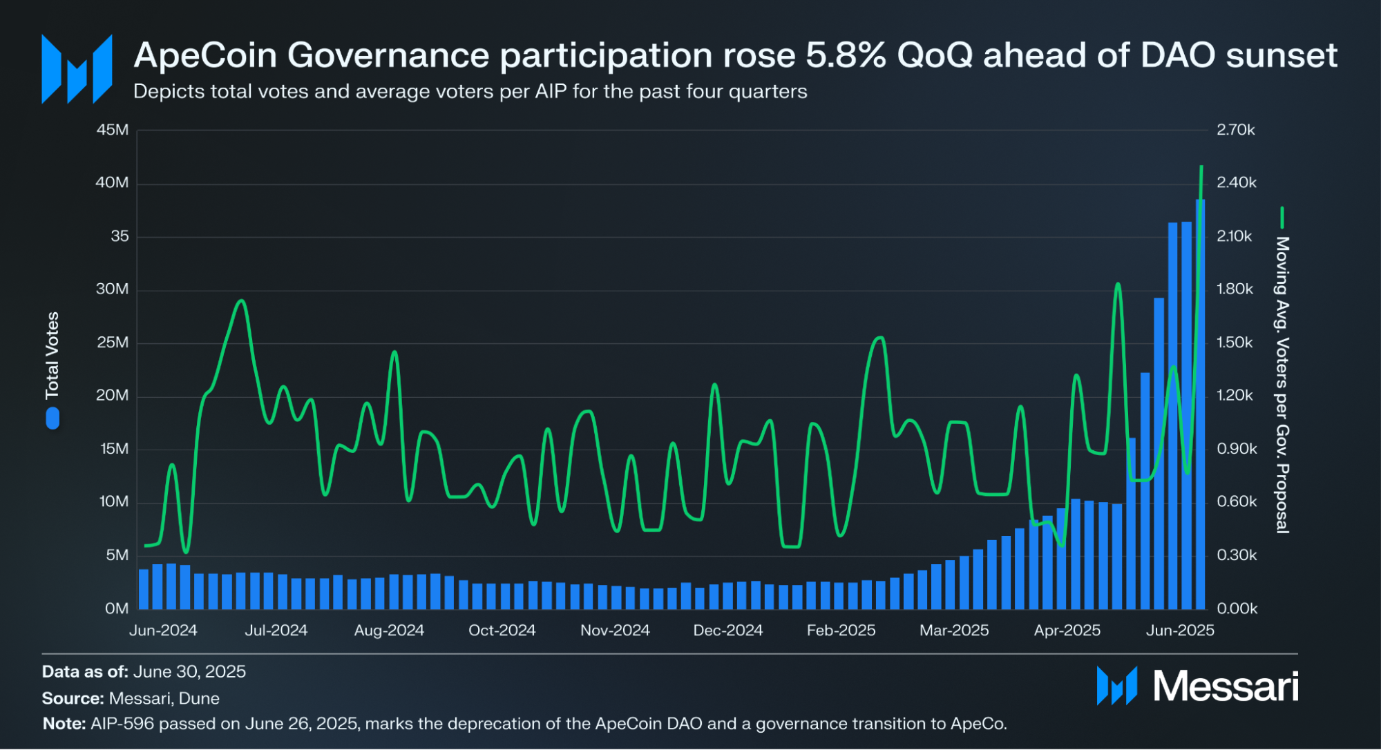가장 주목할 점은 2025년 2분기에 AIP-596이 통과되어 에이프코인 DAO를 공식적으로 해체하고 거버넌스, 자금 지원 권한, 생태계 감독권을 유가 랩스 산하의 새로 창설된 기관인 에이프코로 이전했다는 것이다. 이는 DAO 주도 거버넌스 단계의 종료와 에이프코인을 위한 새로운 행정 구조의 시작을 의미했다. 이러한 구조 조정은 향후 분기에서 보다 효율적인 실행을 지원할 수 있는 간소화된 프레임워크를 제공한다.