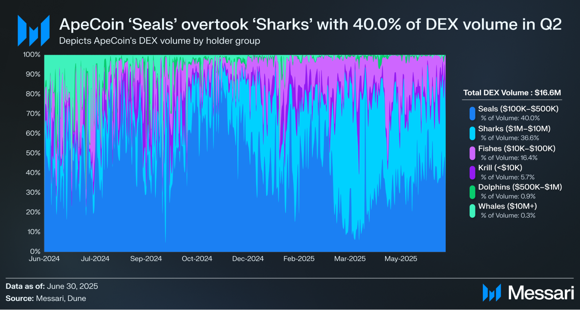 에이프코인은 2분기 총 DEX 거래량 1,660만 달러를 기록했다. 거래 활동은 중간 규모 보유자들에게 집중되었으며, 씰과 샤크 지갑들이 집단적으로 총 거래량의 75.0% 이상을 차지했다.
