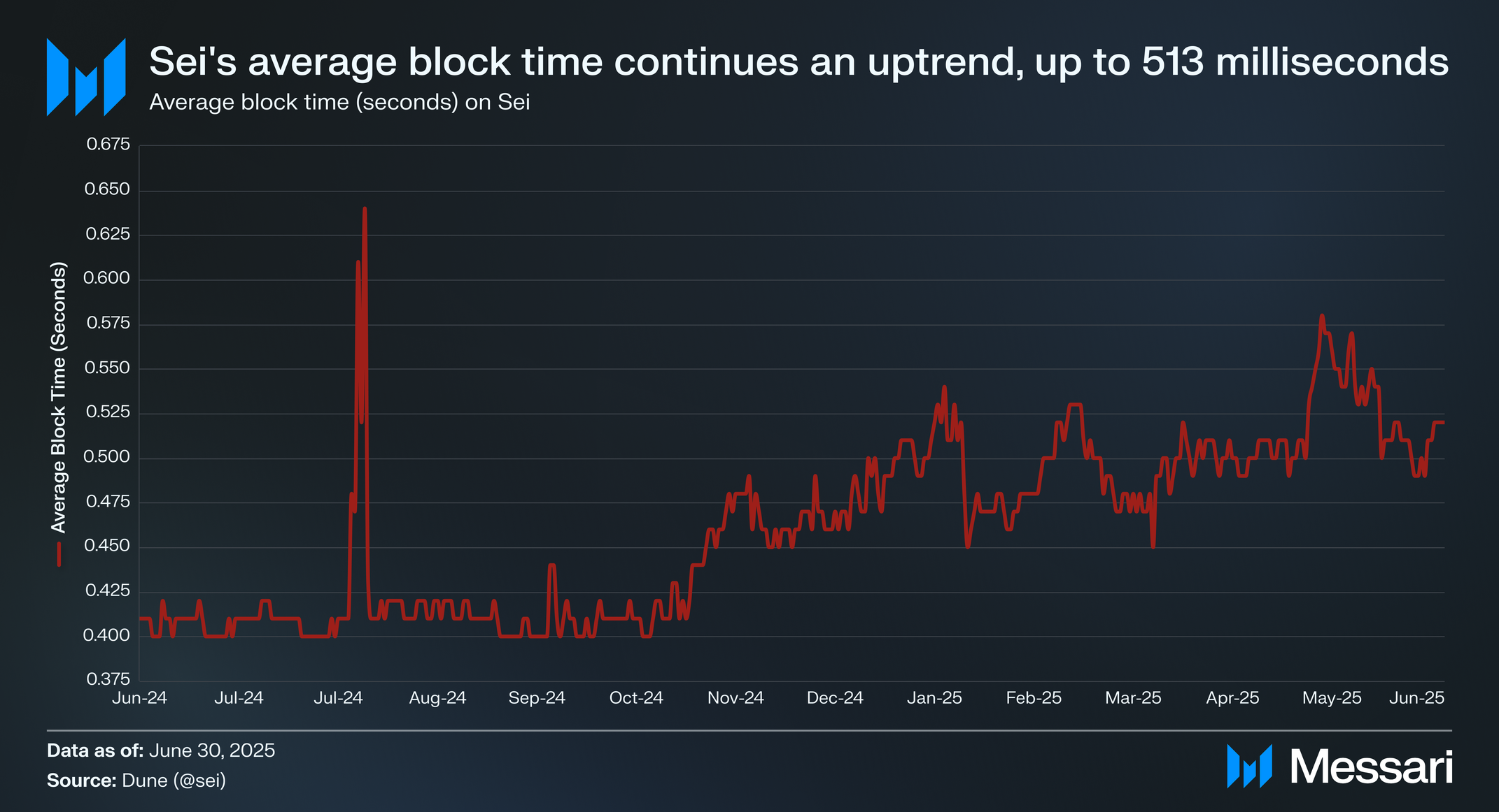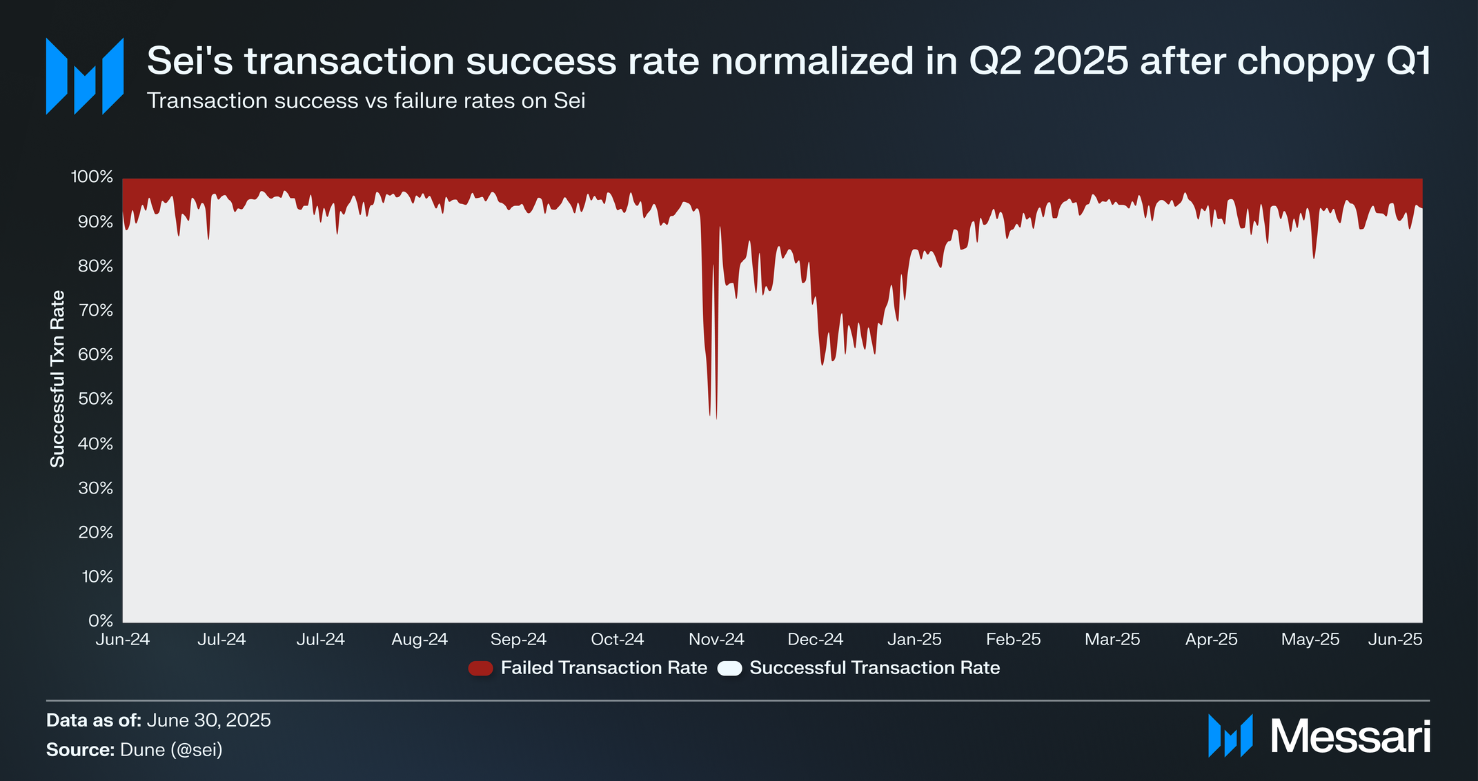 2025년 2분기 세이의 블록 시간은 계속 증가해 평균 492ms에서 513ms로 전분기 대비 4.4% 증가했다. 세이는 또한 2024년 12월과 2025년 1월에 거래 실패율이 각각 22.7%와 29.7%로 급증했다. 거래 실패율은 그 기간 이후 정상화되기 시작해 2월 12.5%, 3월 6.4%로 하락했고, 2025년 2분기 내내 평균 7.7%를 기록했다.
