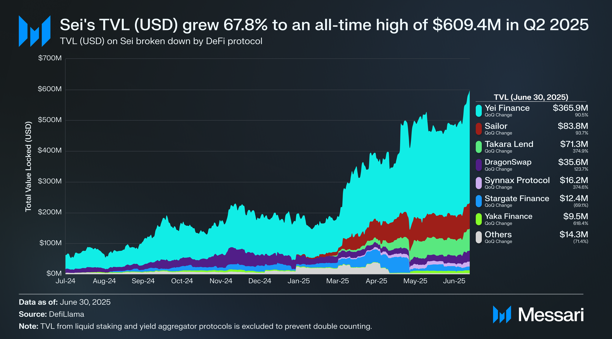 2024년 5월 EVM 호환성을 도입하고 세이의 디파이 생태계를 시작한 세이 V2 출시로부터 1년 이상이 지났다. 2025년 2분기 TVL(USD)은 2분기 연속 성장해 전분기 대비 67.8% 증가하여 사상 최고치인 6억 940만 달러를 기록했다. SEI 가격이 전분기 대비 63.5% 증가해 0.28달러가 되고 토큰이 세이의 디파이 생태계 전반에 걸쳐 적극적으로 활용되면서, TVL(SEI)은 보다 완만한 전분기 대비 2.6% 상승해 21억 6,000만 개를 기록했다.
