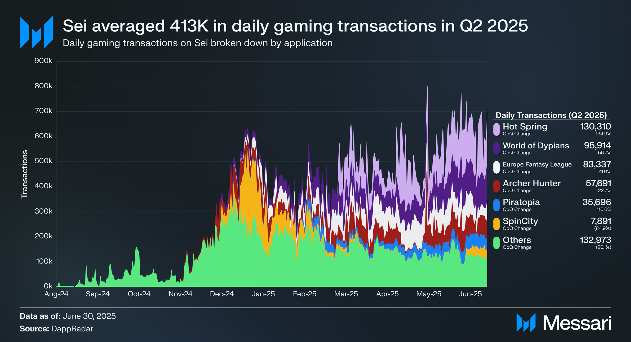 세이의 게이밍 생태계는 2025년 2분기에도 계속 번영했으며, 총 4,950만 건의 게이밍 관련 거래를 기록해 2025년 1분기의 3,990만 건 대비 24% 증가했다. 월드 오브 디피안스(World of Dypians)가 계속 돋보였지만 거래 활동 측면에서는 핫 스프링(Hot Spring)에게 추월당했다.