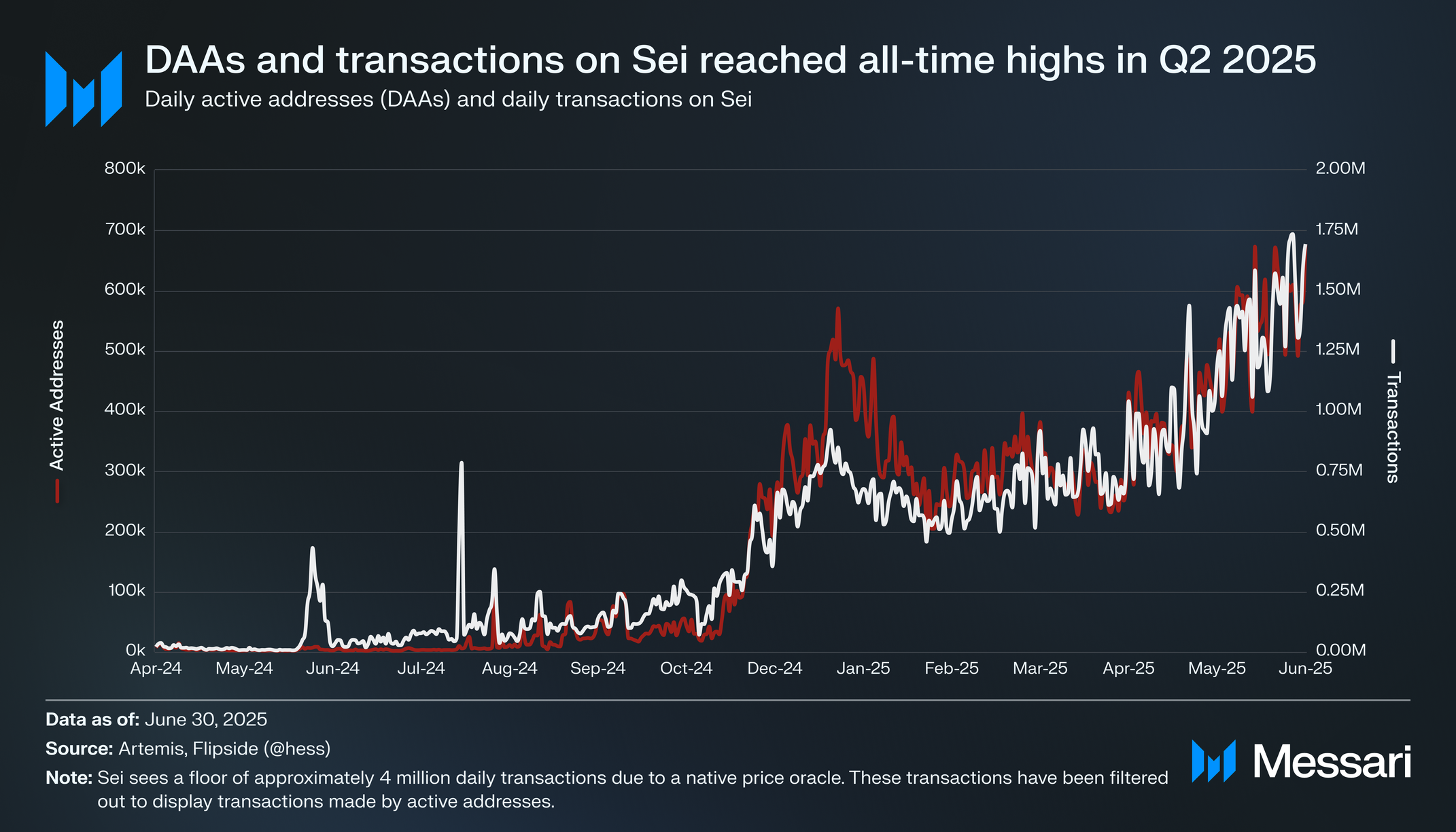평균 일일 활성 주소(DAA)는 2025년 2분기 36.6% 증가해 42만 6,000개를 기록했으며, 활성 주소가 수행한 일일 거래는 12.6% 증가해 72만 300건을 기록했다. DAA와 거래의 주요 상승 추세가 11월 중순부터 시작되어 1월 10일 48만 6,760 DAA와 73만 8,990건 거래의 정점에 도달했다. 이 추세는 2025년 1분기에 안정화되었다가 2025년 2분기에 새로운 사상 최고치를 지속했다. 구체적으로 6월 30일 67만 6,900 DAA와 6월 25일 173만 거래를 기록했다.