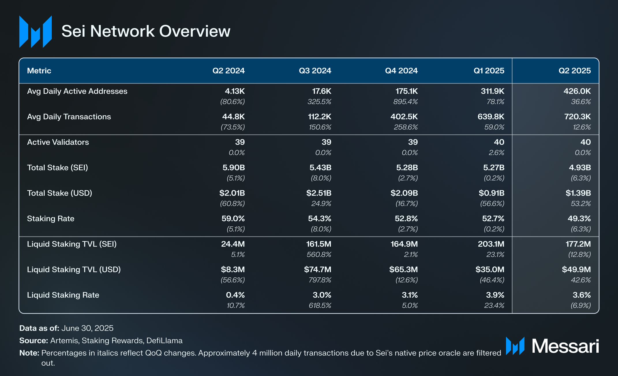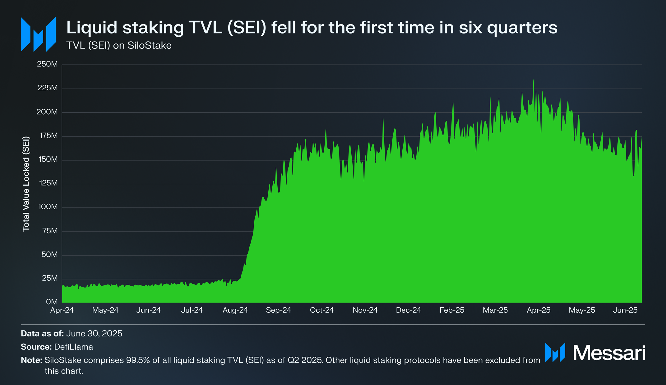 2025년 2분기 말까지 1억 7,620만 SEI가 사일로와 함께 리퀴드 스테이킹되었으며, 이는 2025년 1분기 말 리퀴드 스테이킹된 2억 210만 SEI 대비 12.8% 감소한 수치다. 이는 세이에서 리퀴드 스테이킹 활동이 처음으로 감소한 것이었다. 세이의 총 스테이크(SEI) 대비 리퀴드 스테이킹 비율은 3.9%에서 3.6%로 하락했다.