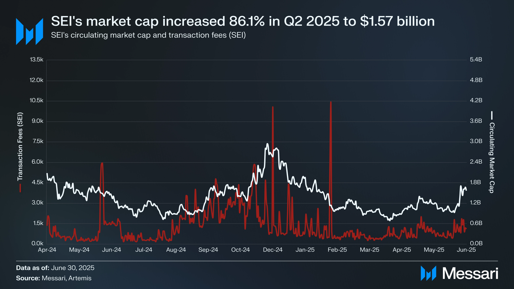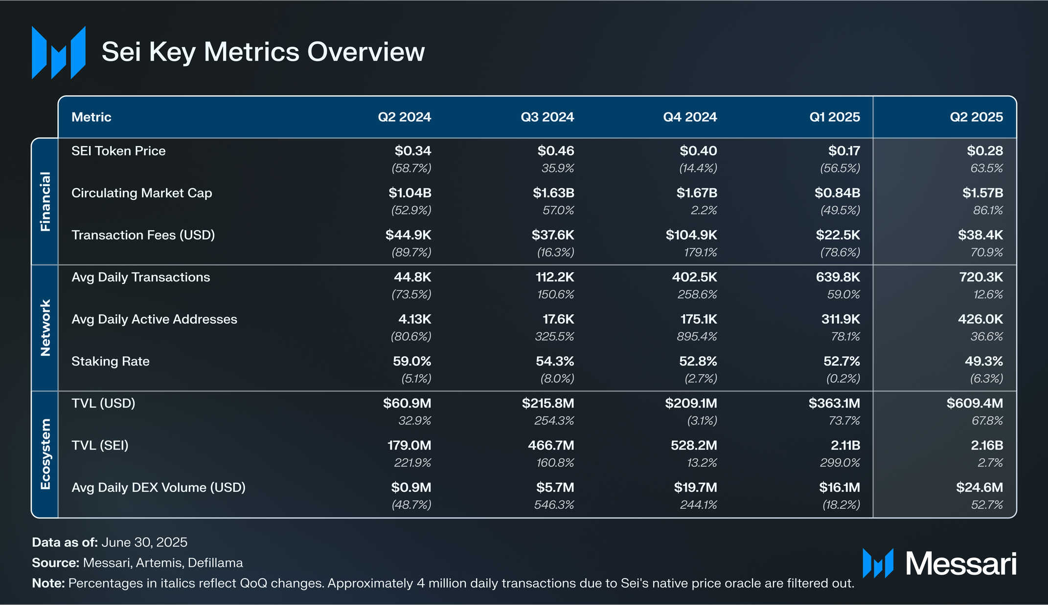 유통 공급량이 전분기 대비 13.8% 증가해 55억 6,000만 개가 되면서, SEI의 유통 시가총액은 더 큰 비율로 증가해 전분기 대비 86.1% 상승한 15억 7,000만 달러를 기록했다. 하지만 토큰의 유통 시가총액 순위는 66위에서 72위로 하락해 broader 시장 대비 약간의 저조한 성과를 보였다.