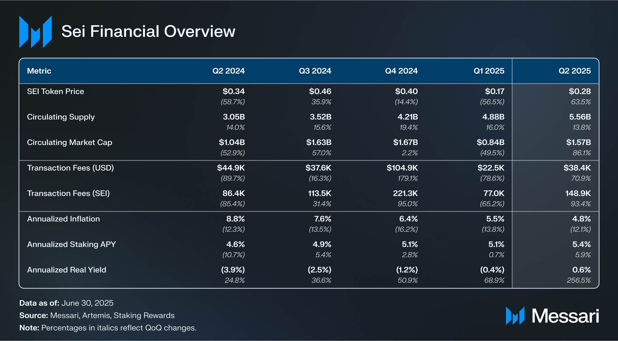 연간 인플레이션이 5.5%에서 4.8%로 감소했다. 스테이킹된 SEI 량이 전분기 대비 6.3% 감소한 것과 결합되어 연간 스테이킹 APY가 5.1%에서 5.4%로 증가했으며, 이는 세이 스테이커들이 처음으로 연간 0.6%의 양의 실질 수익률을 경험한 결과다.