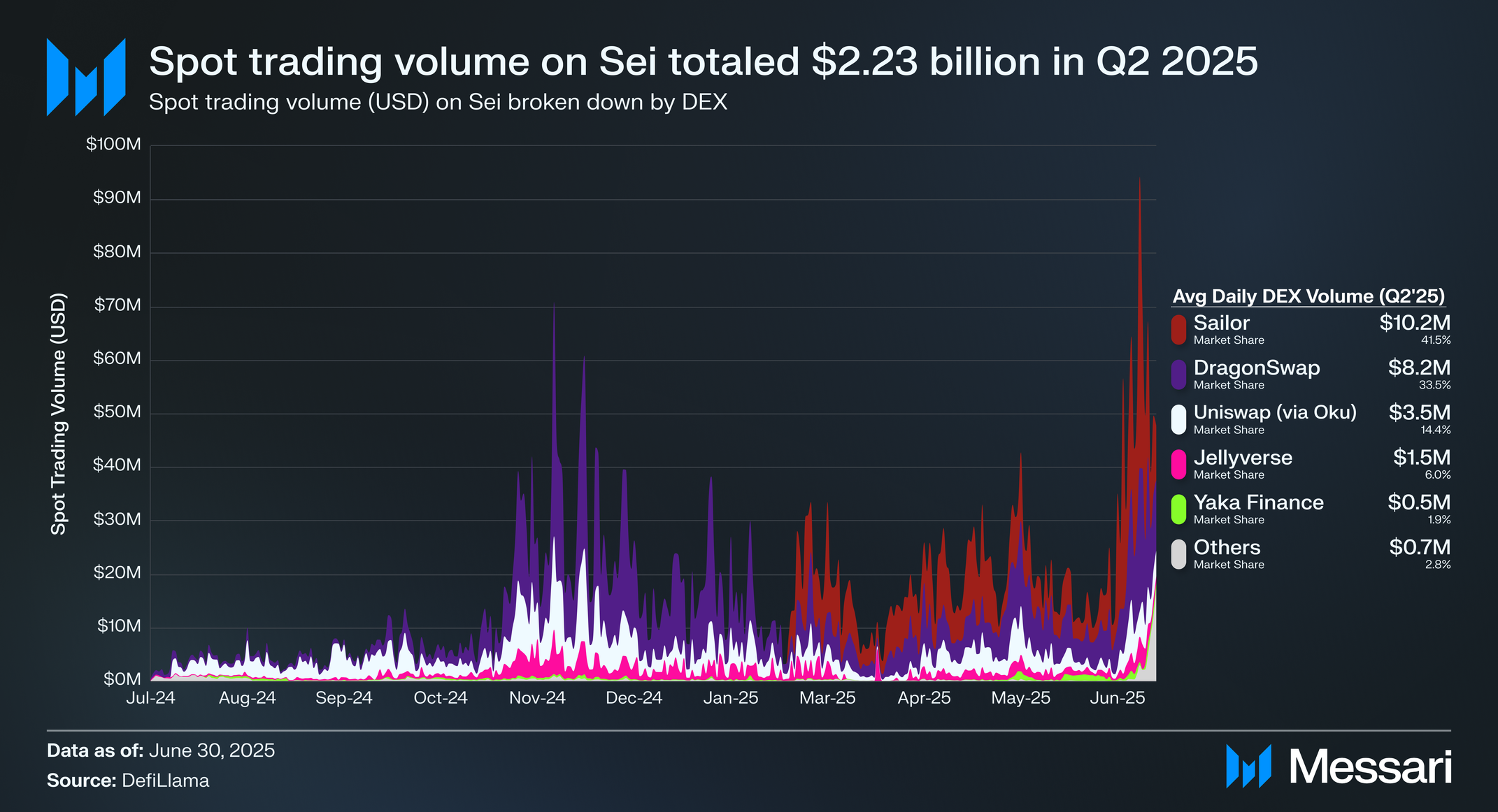 • 세일러: 2025년 1월 출시된 세일러는 주요 통화와 스테이블코인에 집중하며 세이에서 현물 거래량을 장악했다. 이 프로토콜은 2025년 2분기 일일 평균 거래량 1,020만 달러를 기록해 전분기 대비 41.5% 증가했다.
