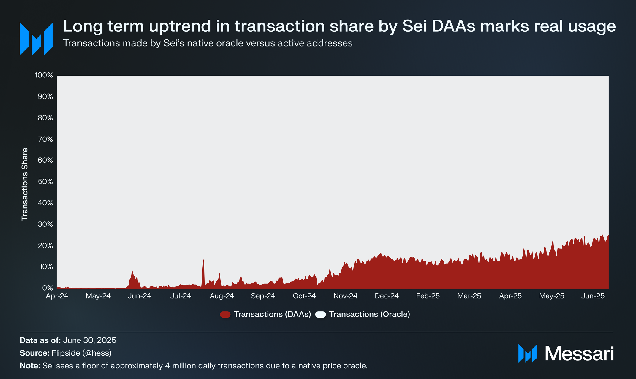 주목할 점은 세이가 네이티브 가격 오라클로 인해 약 400만 건의 일일 거래 하한선을 보인다는 것이다. 모든 검증자들이 투표 거래를 전송하고 격 블록마다 업데이트된 가격 데이터를 제공함으로써 오라클로 참여해야 한다. 이러한 거래들을 제외하면 네트워크의 실제 사용자를 나타내는 활성 주소가 수행한 거래만 남는다.