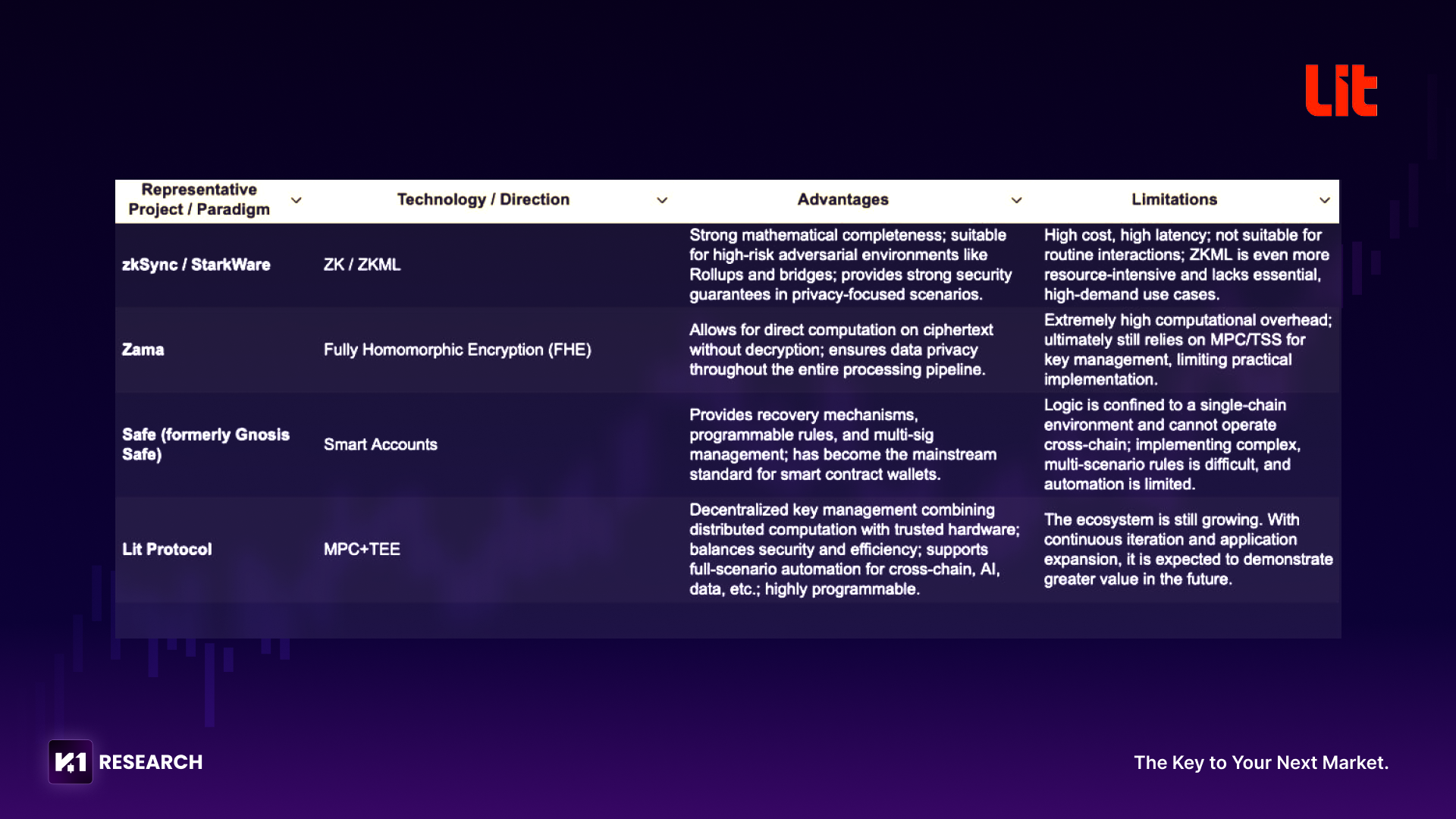 기존 Safeheron과 Fireblocks는 정책 관리 및 API 통합을 지원하지만, 온체인 로직 제어와 유연한 자동화 기능 측면에서 Lit Protocol과 비교할 수 없다. 이로써 Lit는 DeFi, 크로스체인 운영, AI 기반 스마트 에이전트 등 미래형 금융 및 디지털 환경의 핵심 인프라 역할을 수행한다.