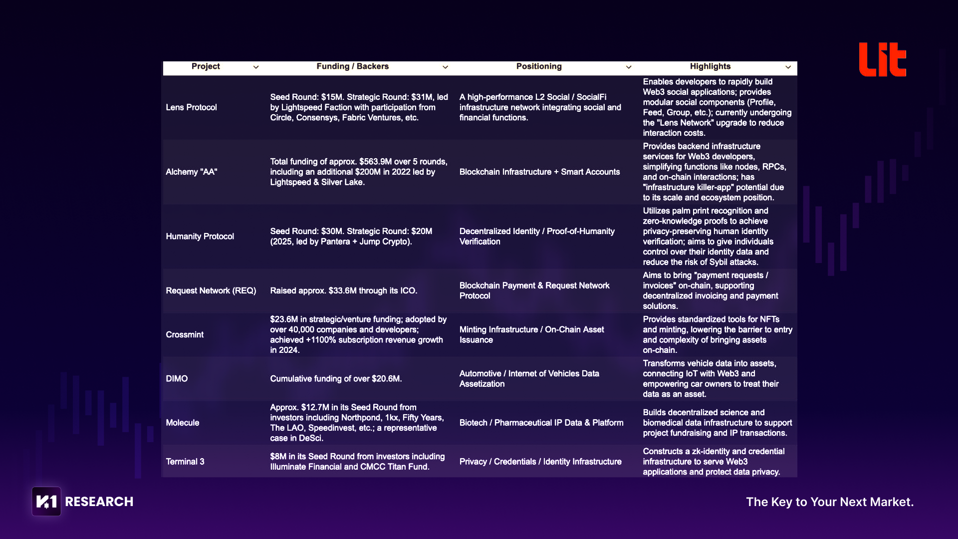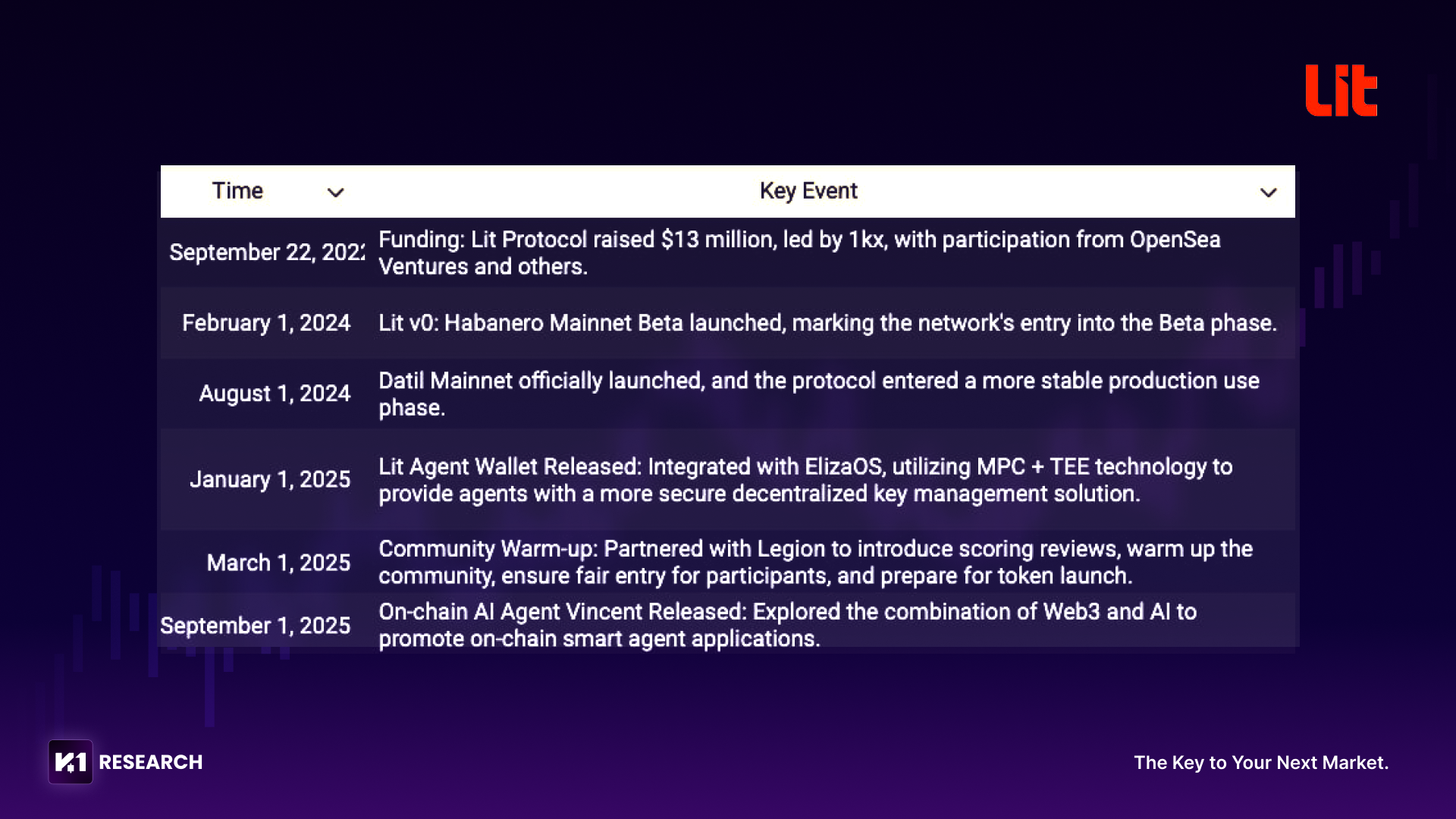 2022년 9월: 1kx 주도 시리즈 A 라운드 1,300만 달러 투자 유치. OpenSea Ventures, Balaji Srinivasan, Stani Kulechov(Aave 창립자), Raj Gokal(Solana 공동 창립자) 참여. 1kx는 탈중앙화 ID 및 Web3 인프라 분야에 장기적으로 투자해온 톱티어 펀드로, Lit Protocol의 기술 로드맵에 강력한 신뢰를 부여. OpenSea Ventures 참여는 NFT 자산 관리와 크로스 애플리케이션 상호운용성 측면에서 Lit의 잠재적 가치를 강조.