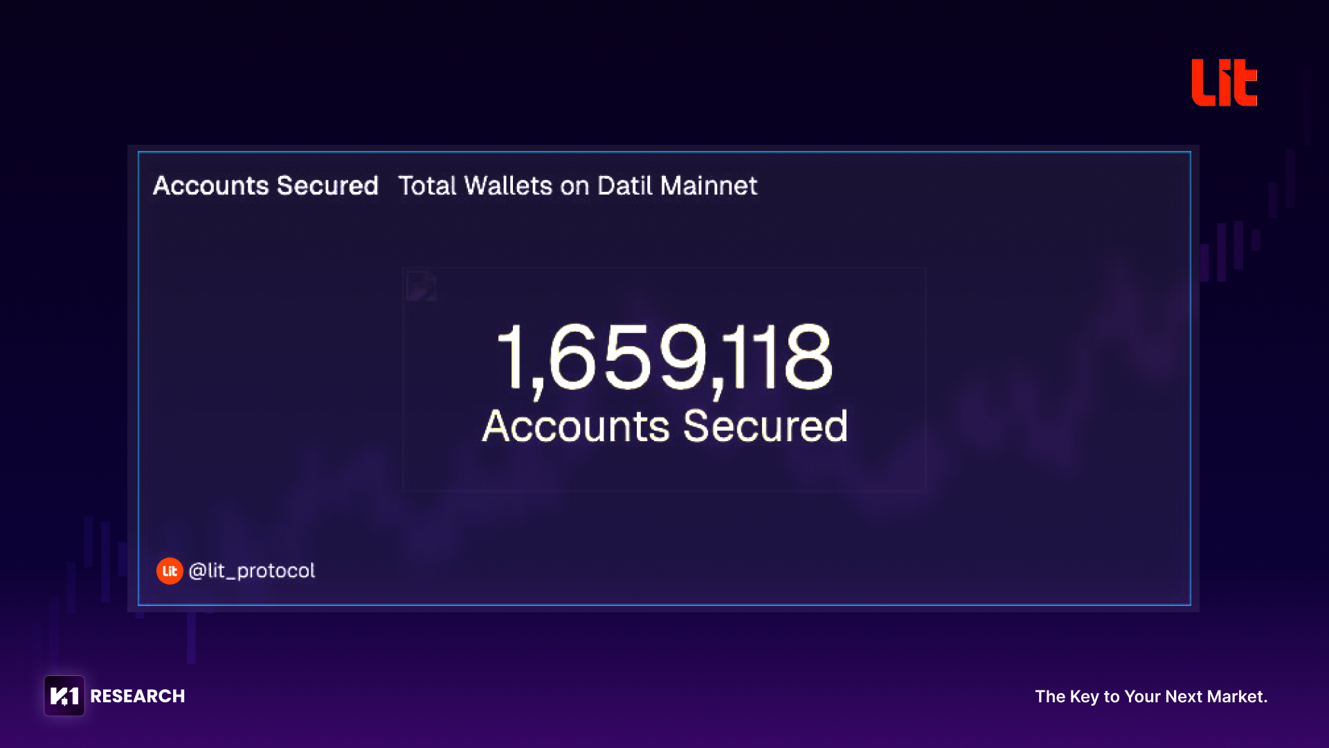 2025년 9월 기준, Lit Protocol은 총 관리 자산(AUM) 3억 4천만 달러를 초과하며, 약 166만 개 지갑 주소를 지원하고 있다. 또한 Alchemy, Lens Protocol, DataverseOS, Humanity Protocol 등 다수 프로젝트에 키 관리 및 접근 제어 서비스를 제공하고 있다. Lit는 정책 기반 자동화, 프라이버시 보호, 프로그래밍 가능한 서명 및 암호화 로직 분야에서 혁신을 선도하며, 업계 내 독보적인 위치를 차지하고 있다.