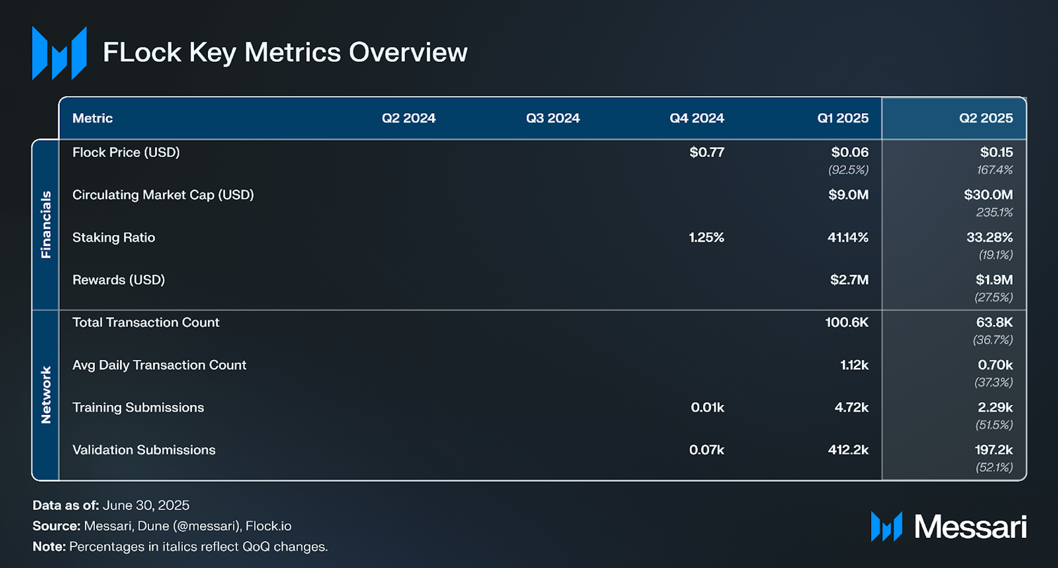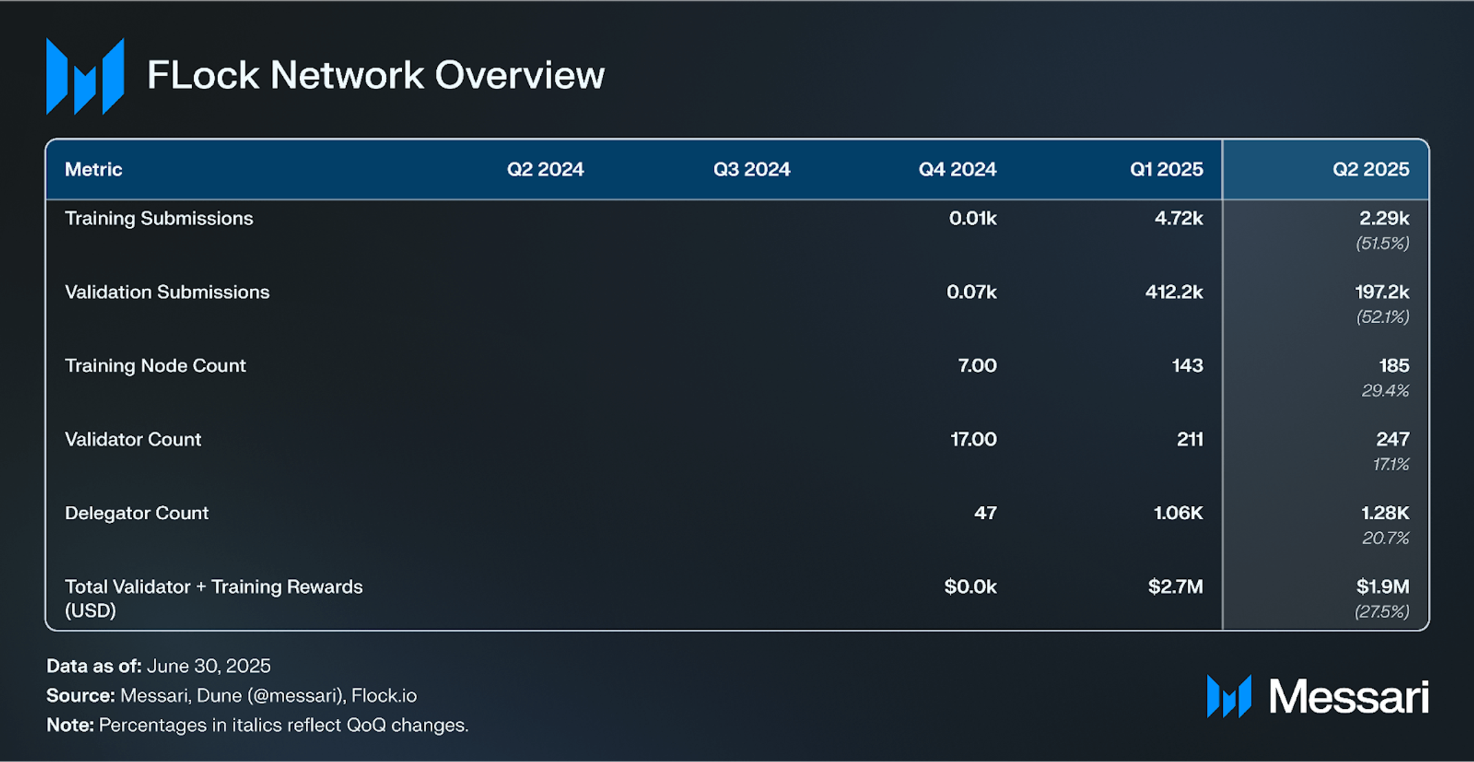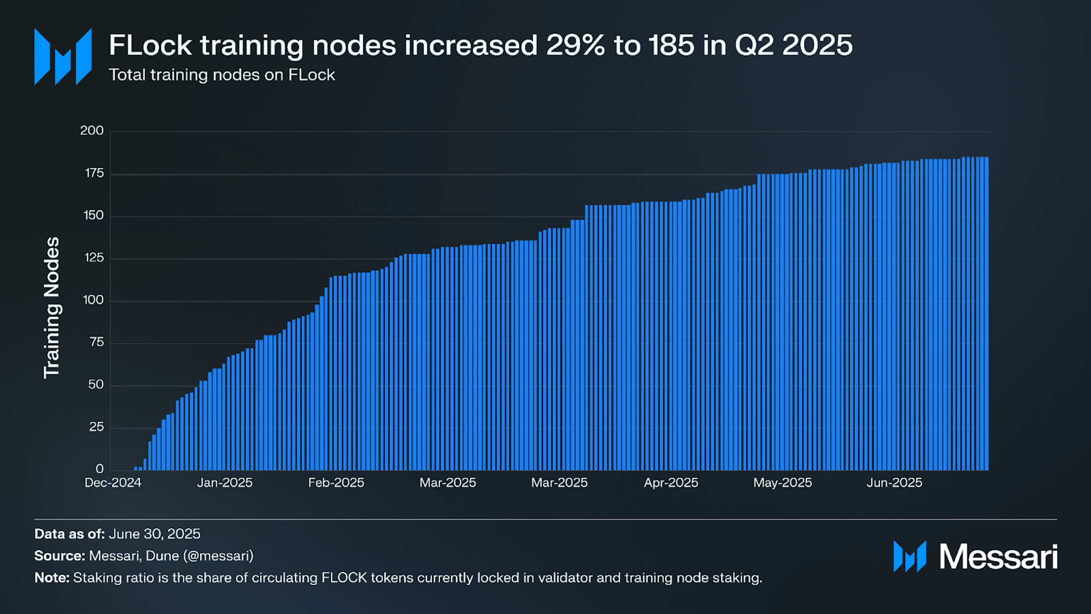 2025년 2분기에 FLock의 유통 시가총액은 235% 증가하여 3,000만 달러를 기록했으며, 유통 공급량이 확대됨에 따라 167% 증가한 토큰 가격을 앞질렀다. 스테이킹 비율은 41%에서 33%로 감소했으며, 이는 감소된 인센티브, 가격 상승 중 차익 실현, gmFLOCK 스테이킹으로의 전환을 반영했다. 트레이닝 노드는 전분기 대비 29% 증가한 185개, 검증인은 17% 증가한 247개, 위임자는 21% 증가한 1,280개를 기록한 반면, 워크로드가 보다 전문화된 작업으로 전환됨에 따라 트레이닝 및 검증 제출은 전분기 대비 52% 감소했다.
