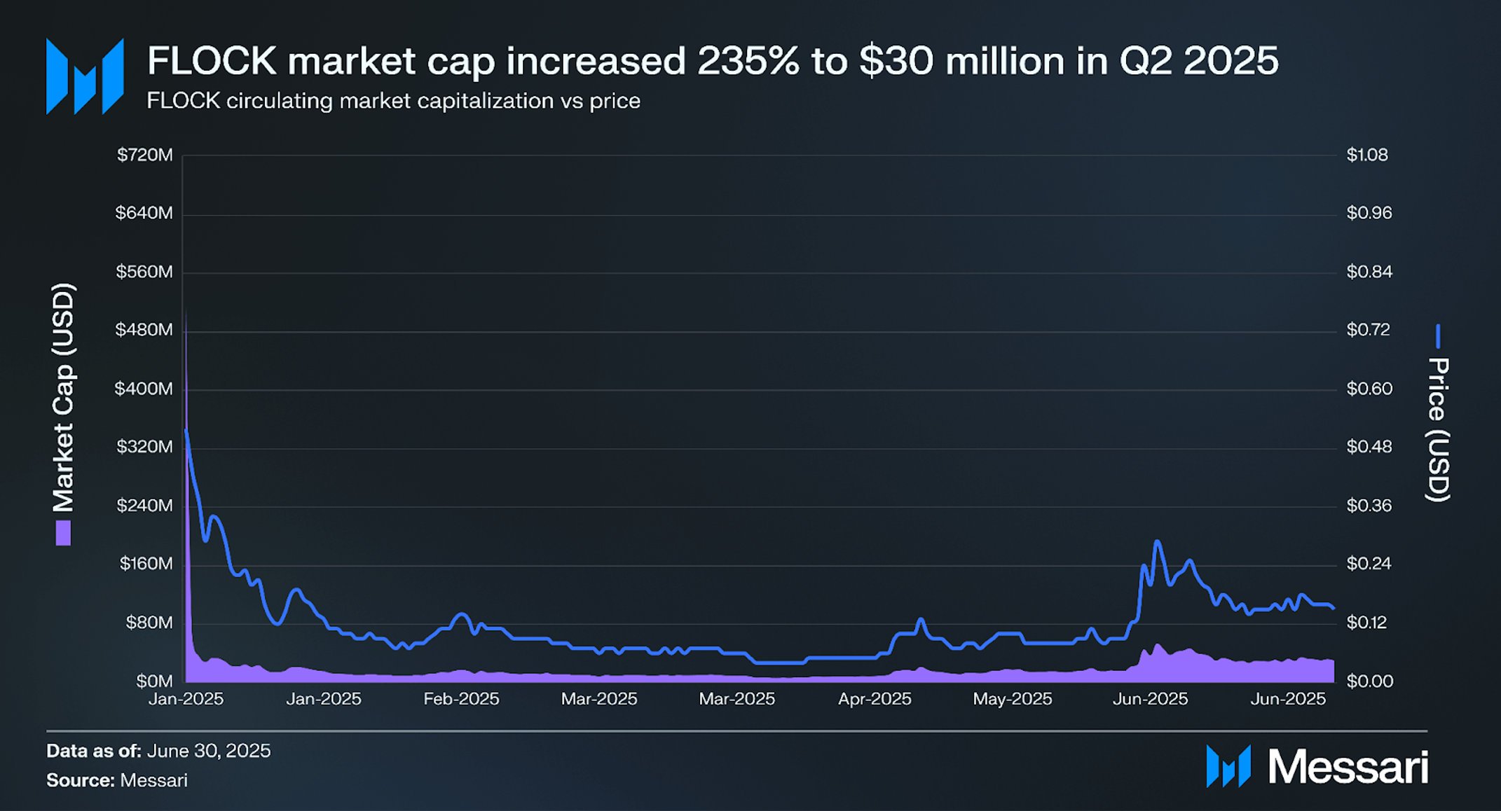 FLOCK의 유통 시가총액은 2025년 2분기에 235% 증가하여 900만 달러에서 3,000만 달러로 상승했으며, 토큰 가격은 0.06 달러에서 0.15 달러로 167% 성장했다. 가격 대비 시가총액의 더 큰 증가는 스테이킹 보상, 생태계 인센티브 또는 예정된 토큰 릴리스를 통해 분기 동안 유통 공급량이 확대되었기 때문이다. 베이스에 유니스왑(Uniswap) 유동성이 추가되면서 시장 접근성이 확대되어 활발히 유통되는 토큰의 비율이 증가했다. 결과적으로 토큰당 더 높은 가치 평가와 더 큰 유통 공급량 모두 전체 시가총액 성장에 기여했다.
