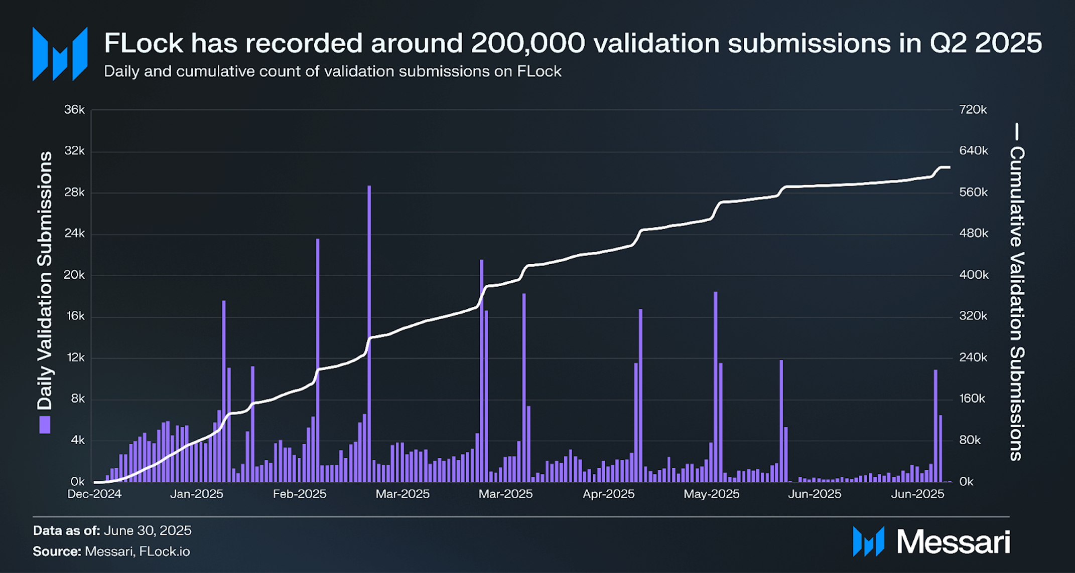 FLock의 검증 제출은 트레이닝 활동과 유사한 궤적을 따랐다. 일일 제출은 2025년 1분기 41만 2,000개 이상으로 급증했지만 2분기 약 19만 7,000개로 감소하여 전분기 대비 52% 감소했다. 그럼에도 불구하고 누적 검증 제출은 계속 증가하여 지속적인 참여를 나타냈다.