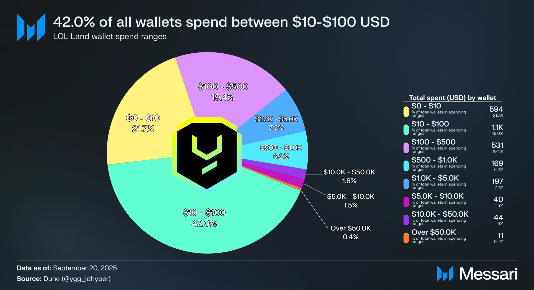 LOL 랜드 지출자의 42% 이상이 10달러에서 100달러 사이를 지출했다. 이는 플레이어들이 쉽게 참여하고 소액을 지출하며 NFT와 YGG 토큰으로 교환할 수 있는 포인트를 얻을 기회를 위해 플레이할 수 있는 '캐주얼 디젠' 게임을 설계하려는 YGG의 의도와 일치한다. 동시에 이 게임은 고액 지출자들을 유치했다. 55개 이상의 지갑이 1만 달러 이상을 기여했고, 11개 지갑은 5만 달러 이상을 지출했다. 이러한 바벨형 분포는 LOL 랜드가 스펙트럼 전반에 걸쳐 호소력이 있음을 보여줬다. 광범위한 캐주얼 사용자 기반을 참여시키면서 고래들로부터 상당한 가치를 포착했다. 이러한 혼합을 반영해 YGG의 사용자당 평균 수익(ARPU)은 1,020달러에 달했다. 전통적인 게임 타이틀보다 높은 수치로, YGG 플레이의 설계가 캐주얼 사용자를 위한 접근성과 고래들의 지출을 결합하는 방식을 부각시켰다.