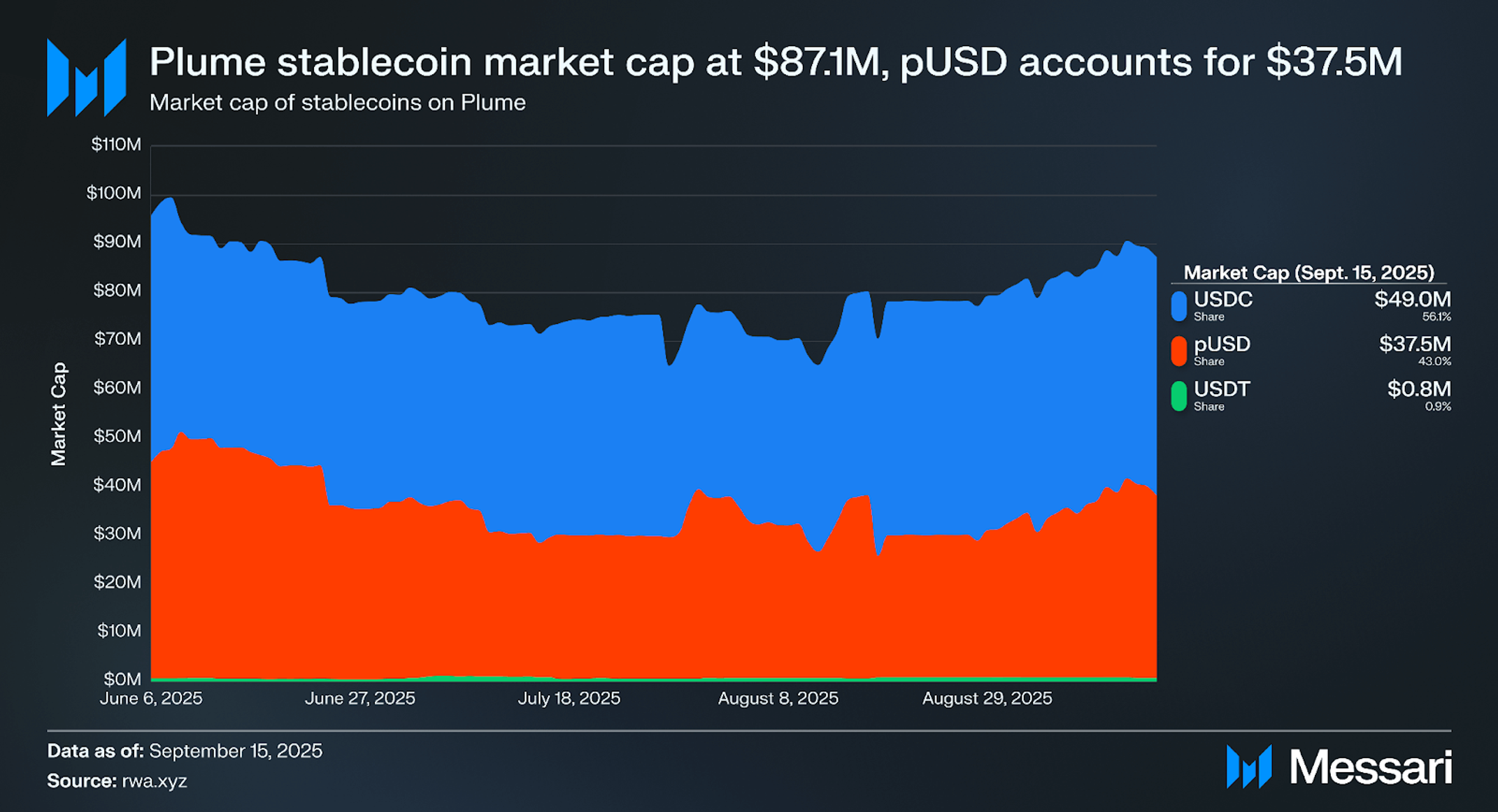 2025년 9월 15일 기준, 플럼의 총 스테이블코인 시가총액은 8천7백만 달러다. 가장 큰 비중은 브리징된 USDC가 차지하며 4천9백만 달러를 차지한다. 플럼의 네이티브 스테이블코인인 pUSD는 3천7백만 달러의 시가총액을 보유한다. 브리징된 USDT는 80만 달러의 유통량으로 나머지를 구성한다.
