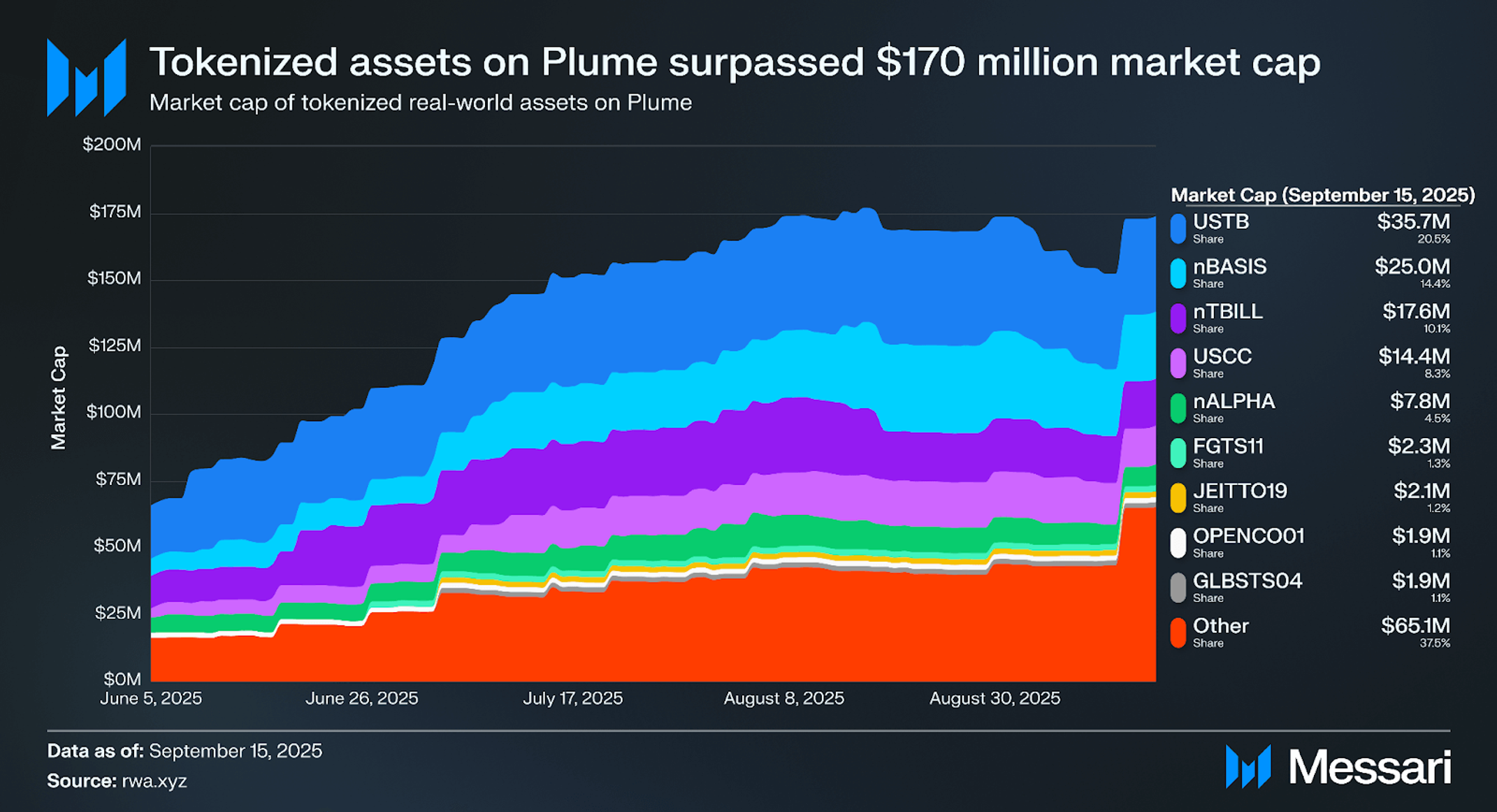 플럼은 6천5백만 달러의 토큰화된 자산으로 출시했으며, 2025년 9월 15일까지 1억7천만 달러로 성장했다. rwa.xyz에 따르면, 현재 네트워크에는 20만2천 개 이상의 주소에 분산된 144개의 토큰화된 자산이 있다. 시장 점유율 기준 가장 큰 자산들은 슈퍼스테이트, 네스트, 메르카도 비트코인이 배포했다.