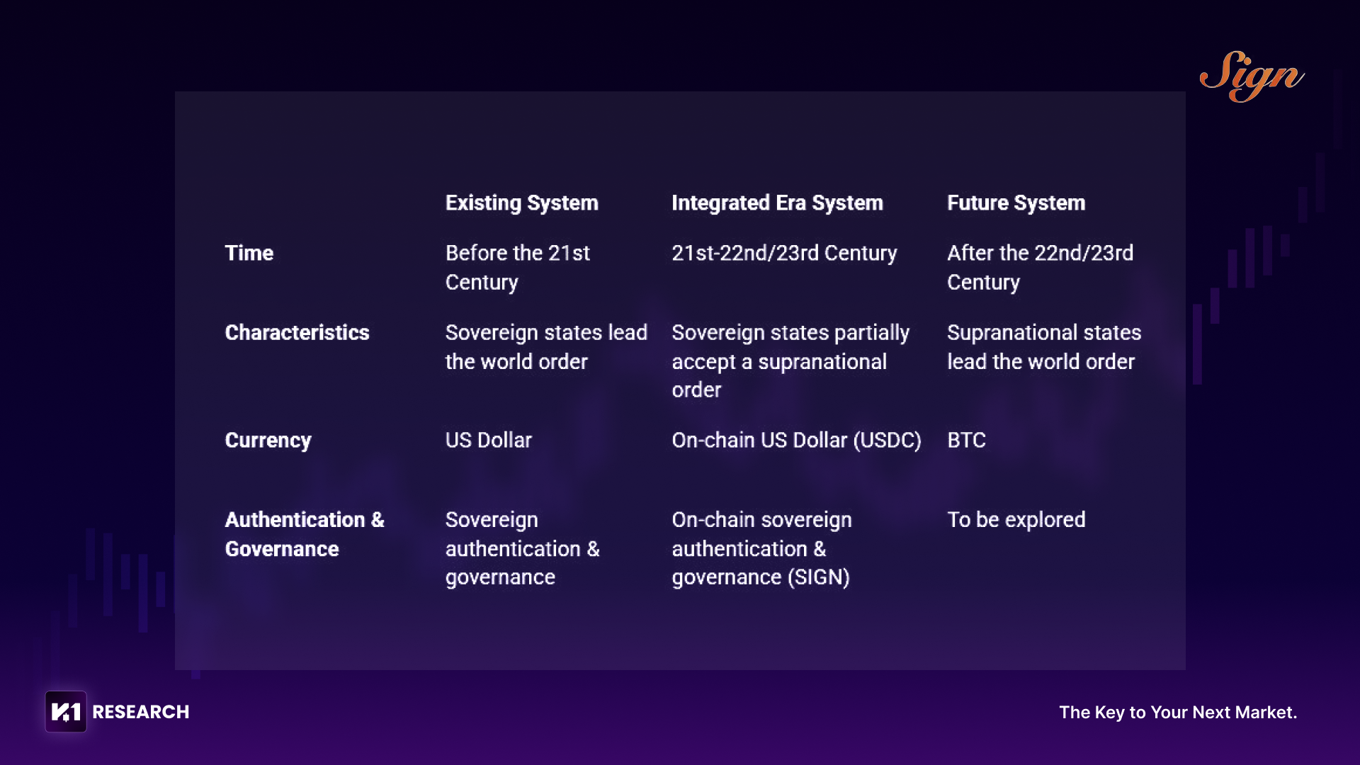 ● 역사적 유사성: USDC가 전통적 달러(USD)와 네이티브 암호자산(BTC 등) 사이의 금융적 다리를 구축했다면, SIGN은 주권 기반 거버넌스에서 온체인 거버넌스로, 나아가 초국가적 거버넌스로 이어지는 인증 인프라의 다리를 구축하고 있다. 즉, SIGN은 “거버넌스 레이어의 USDC”라 할 수 있다.