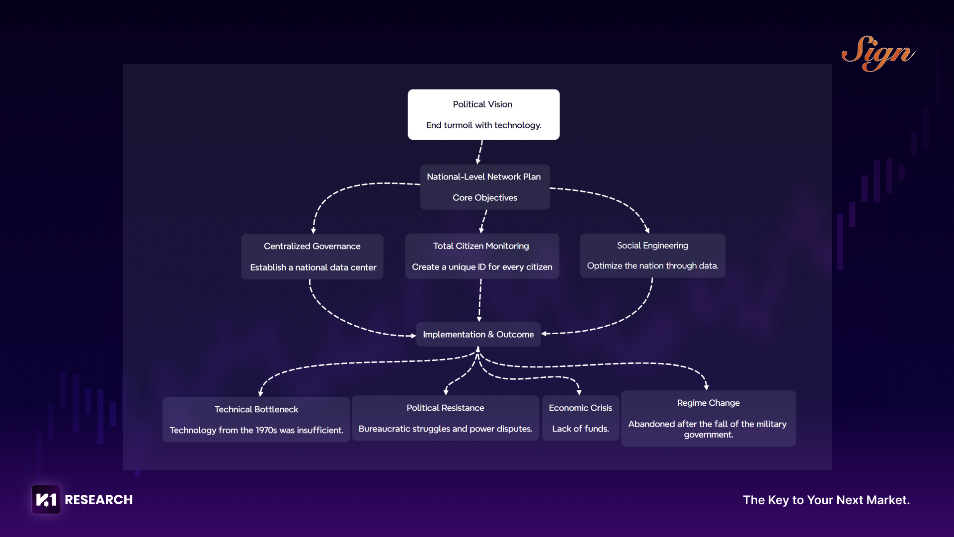 하지만 당시 기술로는 실시간 데이터 처리와 네트워크 연결이라는 거대한 비전을 지원할 수 없었고, 관료적 갈등 및 기타 요인으로 인해 이 계획은 초기 단계에서 실패했다. 그럼에도 불구하고 이러한 사회 실험은 미래 세대에 많은 영감을 남겼다. 또한 칠레는 유사한 프로젝트인 “Project Cybersyn” 을 시행했다. 기술적 업그레이드와 새로운 개념이 결합된다면, 결국 디지털 인프라 기반의 국가 거버넌스 시대가 도래할 것으로 기대된다.