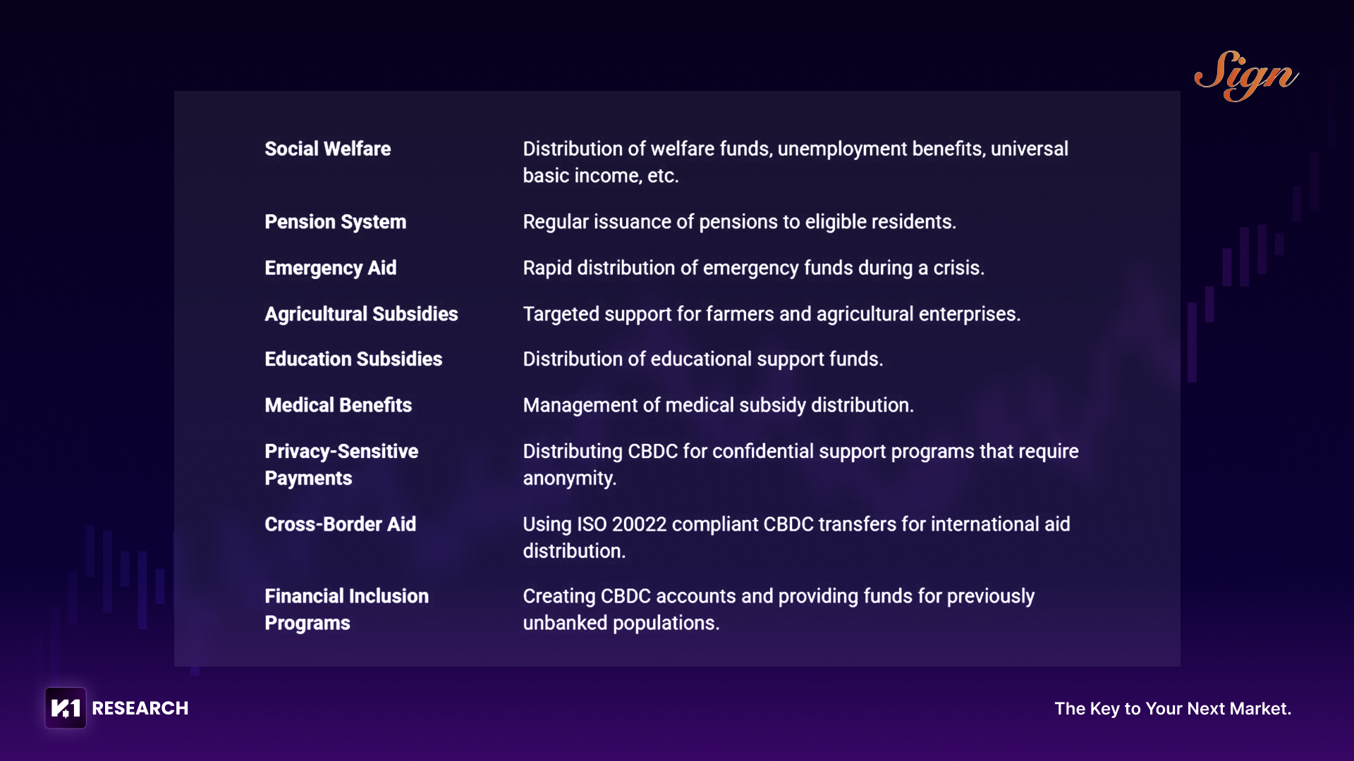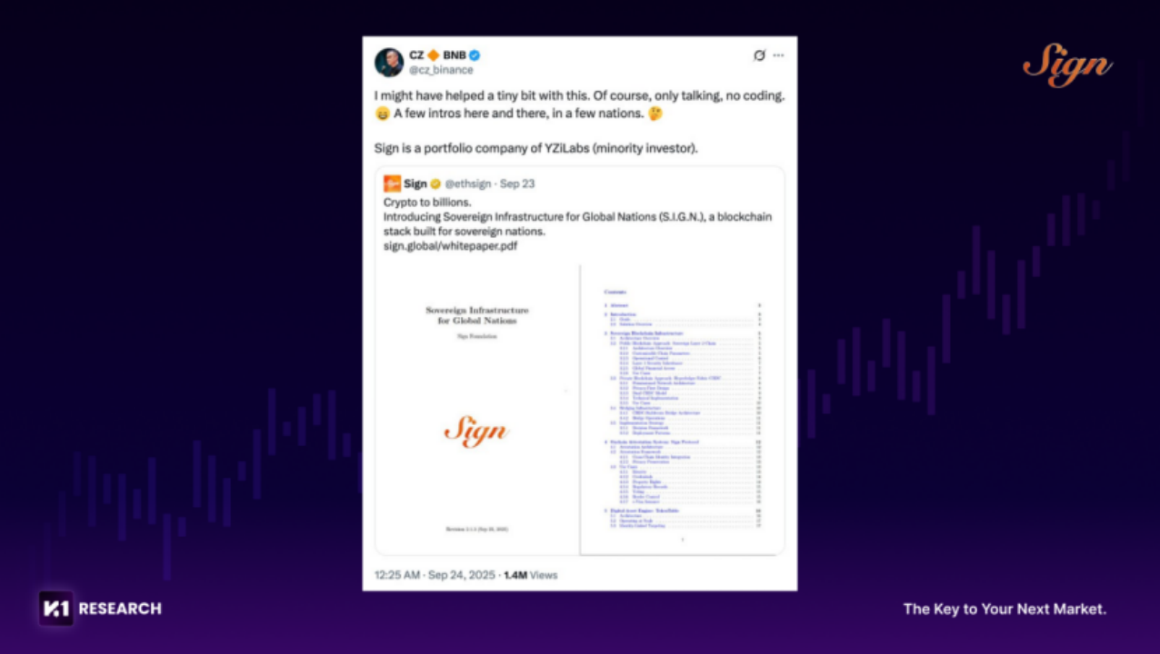 이 분야에서 SIGN은 가장 선도적인 프로젝트 중 하나로, 현재 전 세계 여러 국가들과 공동 논의 및 구축 작업을 진행하고 있다. 투자사인 YZi Labs가 이 과정을 지원하고 있으며, CZ(전 바이낸스 CEO) 또한 직접 SIGN이 여러 국가 정부와 소통하도록 돕고 있다고 언급한 바 있다.