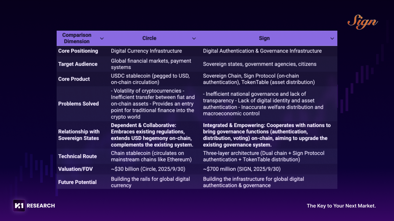 ● 명확한 가치 평가 논리: SIGN의 현재 FDV(완전 희석 시가총액)는 10억 달러 미만이지만, 온체인 달러 레일을 구축한 Circle(USDC 발행사)이 그 벤치마크가 된다. 두 프로젝트 모두 구(舊)세계의 핵심 요소(USD / 주권 거버넌스)를 블록체인 위로 “온체인화”했다는 점에서, SIGN은 1,000억 달러 가치 평가 잠재력을 지닌 명확한 로직을 갖는다.