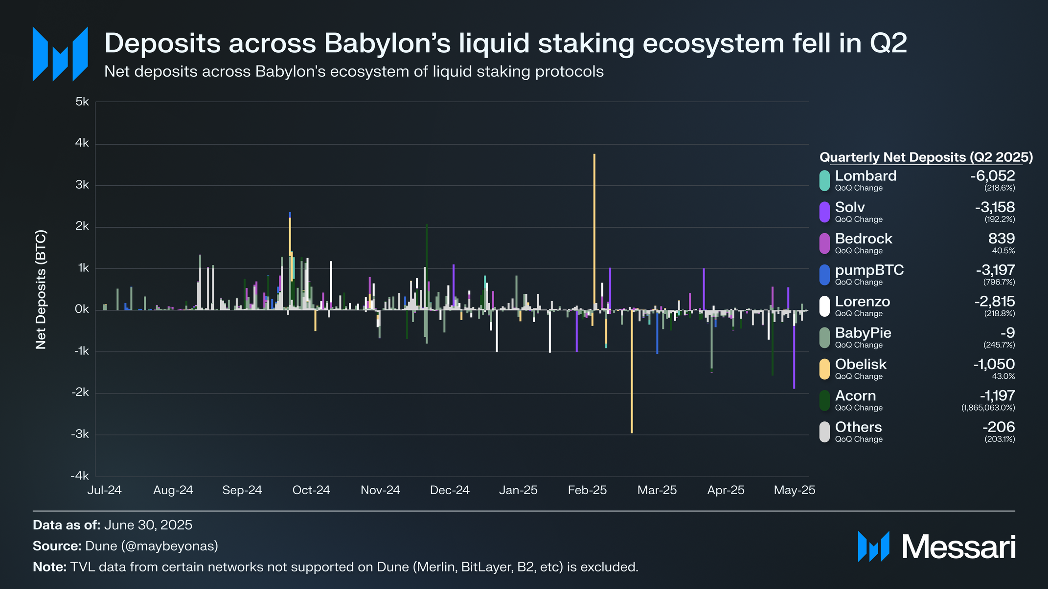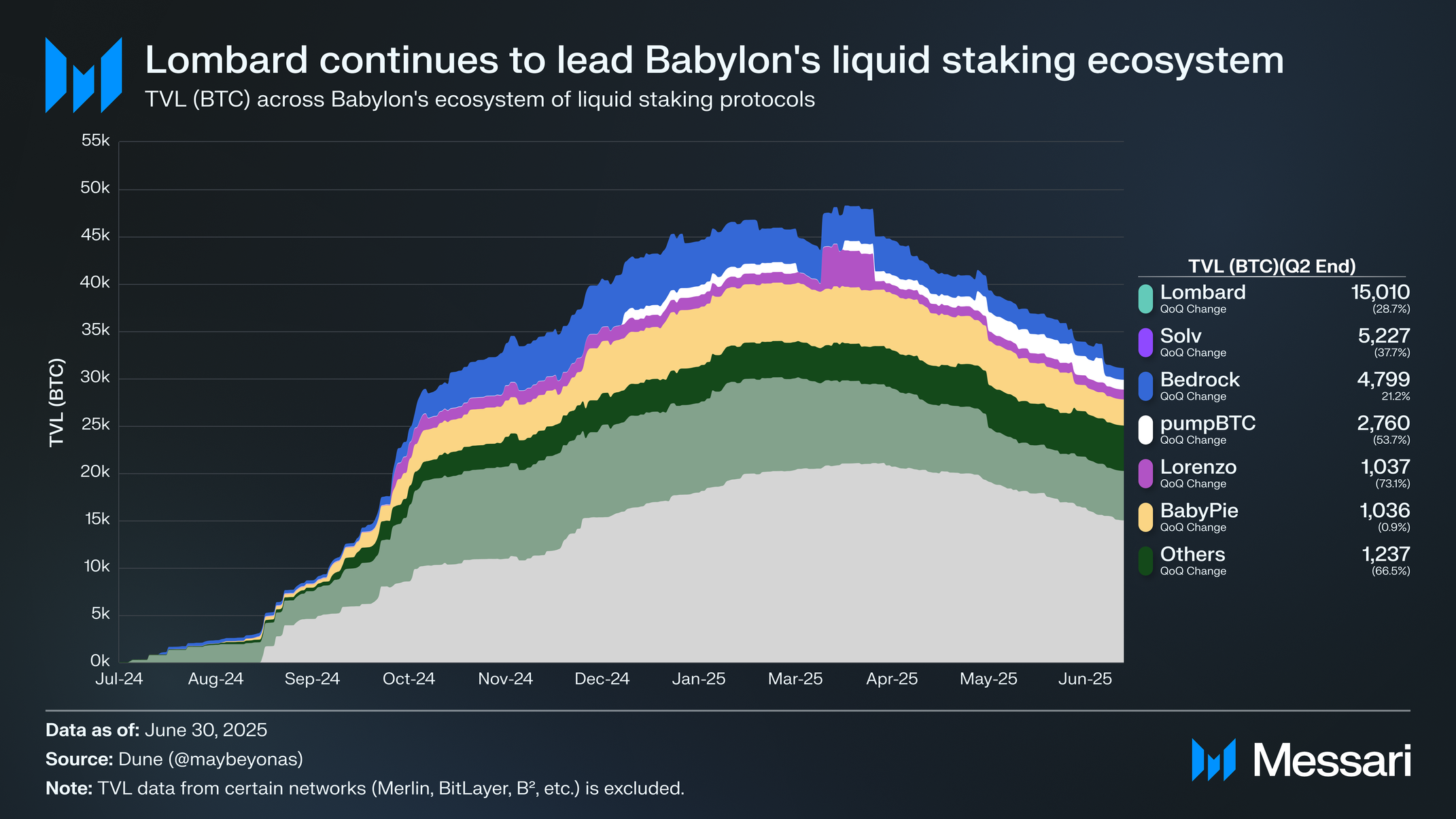2025년 2분기 말까지 바빌론의 TVL은 롬바드 파이낸스의 대규모이지만 일시적인 인출에 따라 전분기 대비 12.6% 감소한 45,600 BTC를 기록했다. 리퀴드 스테이킹 활동은 대부분의 프로토콜에서 축소되었으며, 베드록만 순유입을 기록했다. 롬바드는 예치 점유율 기준 최대 프로토콜로 남았지만, TVL은 전분기 대비 28.7% 감소한 15,010 BTC(시장 점유율 48.3%)를 기록하여 LBTC가 다섯 번째로 큰 비트코인 파생상품으로 떨어졌다.