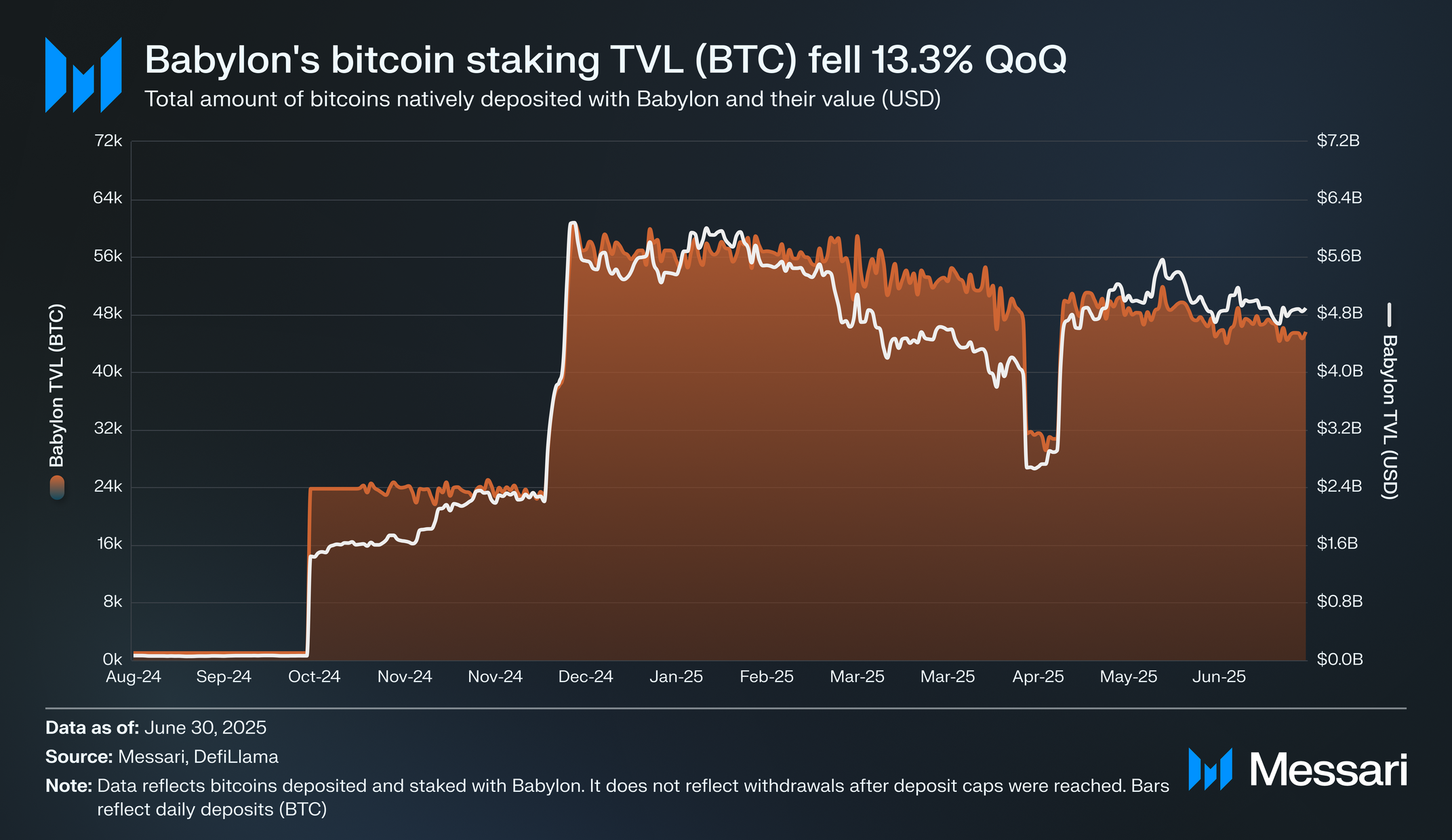 2025년 2분기에 바빌론의 스테이킹 프로토콜에 잠긴 총 비트코인을 나타내는 총 예치 가치(Total Value Locked, TVL)는 달러 기준 전분기 대비 12.6% 감소하여 분기 말 49억 달러를 기록했다. 비트코인으로 표시할 경우 TVL은 전분기 대비 13.3% 감소한 45,600 비트코인을 기록했다.