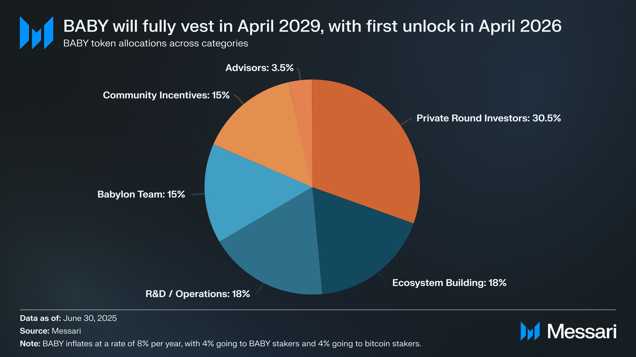 • R&D / 운영(18%): 18억 개의 BABY는 바빌론 재단 운영과 "프로토콜 및 인프라 개발과 비트코인의 네이티브 사용 사례 발전을 위한 연구 개발 활동"에 자금을 지원할 예정이다.
