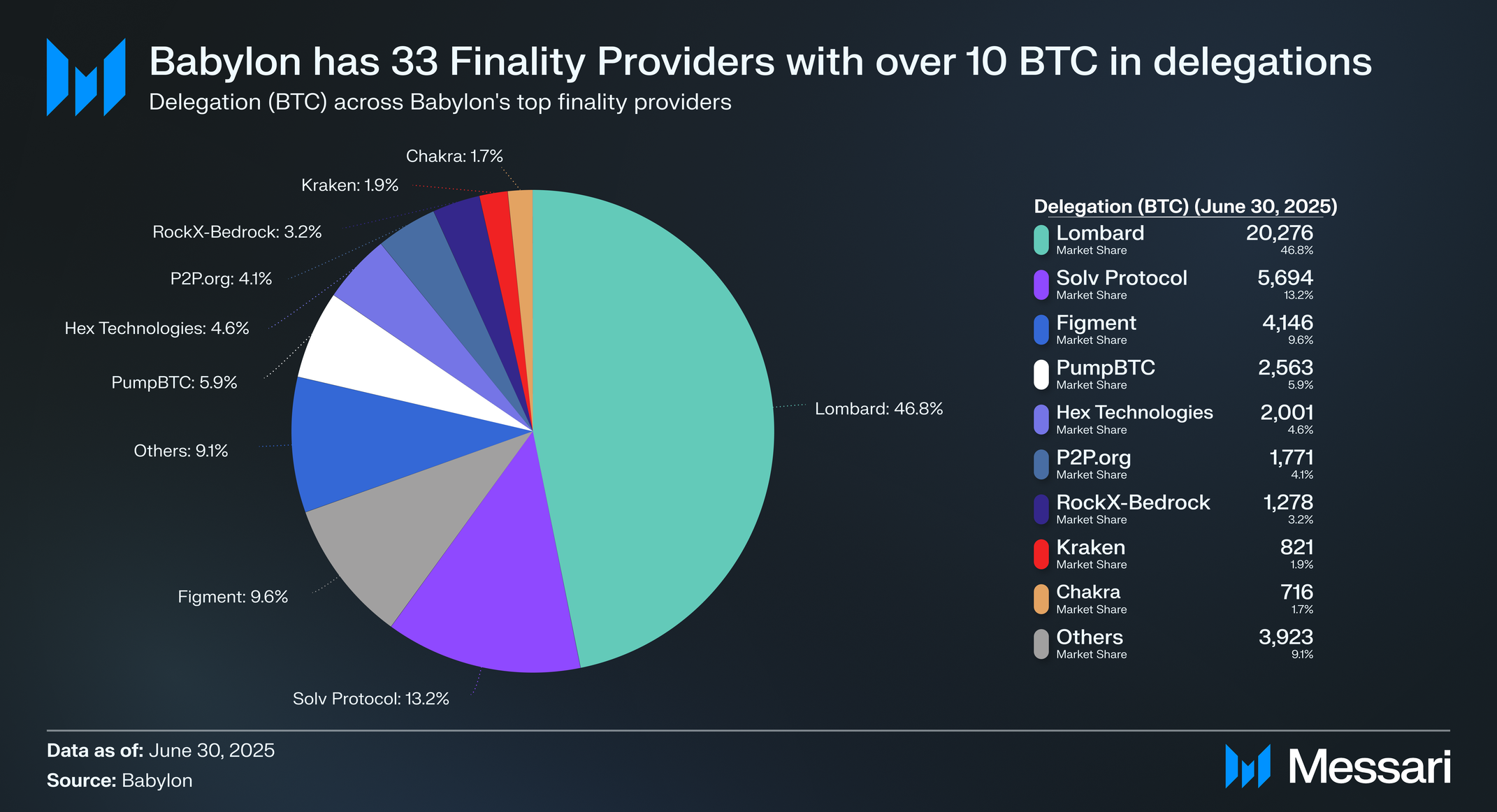 2025년 2분기 말까지 33개의 파이널리티 프로바이더(FPs)가 10개 이상의 비트코인을 위임받았다. 상위 4개 FP는 리퀴드 스테이킹 프로토콜(롬바드, 솔브, 피그먼트(Figment), 펌프BTC(PumpBTC))로 바빌론의 총 위임 비트코인의 75.5%를 차지했으며, 분기 말 총 32,679개를 기록했다.