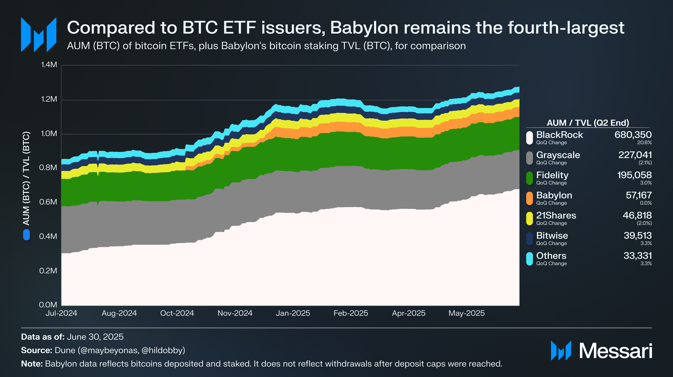 총계로, 2분기 말 바빌론의 비트코인 스테이킹 TVL(BTC)은 비트코인 유통 공급량의 0.23%에 해당했다. 비트코인 상장지수펀드(Exchange-Traded Funds, ETFs)는 2024년 1월에 출시되었다. 이러한 상품의 운용자산(Assets Under Management, AUM)은 지속적으로 증가하고 있으며 2025년 2분기 말 총 AUM(BTC)은 120만 개를 기록했다. 비트코인 ETF와 비교할 때, 바빌론의 프로토콜은 블랙록(BlackRock), 그레이스케일(Grayscale), 피델리티(Fidelity)에 이어 네 번째로 많은 양의 비트코인을 축적했다.