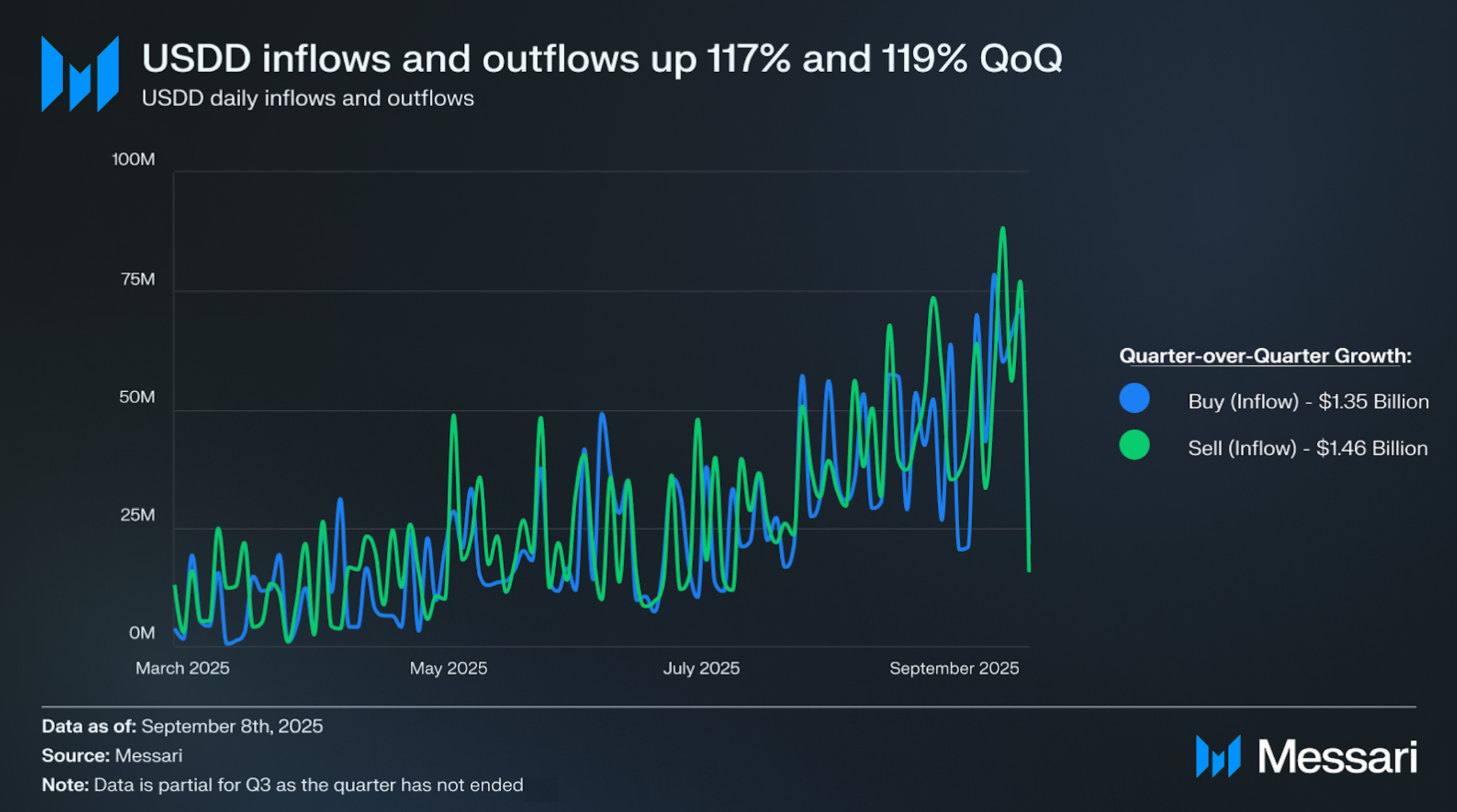 지난 2개 분기 동안의 PSM 흐름은 USDD 안정성에서 PSM의 중심 역할을 강조한다. Q3가 아직 끝나지 않았지만, 총 유입량(사용자가 USDT/USDC로 USDD 발행)은 2025년 9월 8일 기준으로 이미 전분기 대비 117% 증가하여 11억 5천만 달러에서 25억 달러로 늘었다. 유출량(상환)은 같은 기간 동안 전분기 대비 119% 증가하여 12억 4천만 달러에서 27억 달러로 늘었다. 이러한 활동은 PSM이 이제 수요의 큰 변동을 흡수할 수 있으며, 차익거래자들이 USDD를 페그로 가져오는 것을 촉진함을 시사한다.