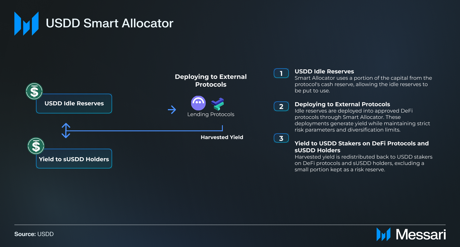 • 지속 가능한 수익 엔진으로서의 스마트 알로케이터(Smart Allocator): 스마트 알로케이터는 PSM에서 파생된 준비금을 사용하여 지속 가능한 온체인 수익을 창출하며, 이더리움에서 sUSDD와 같은 미래의 이자 발생 상품을 구동할 위치에 있다.