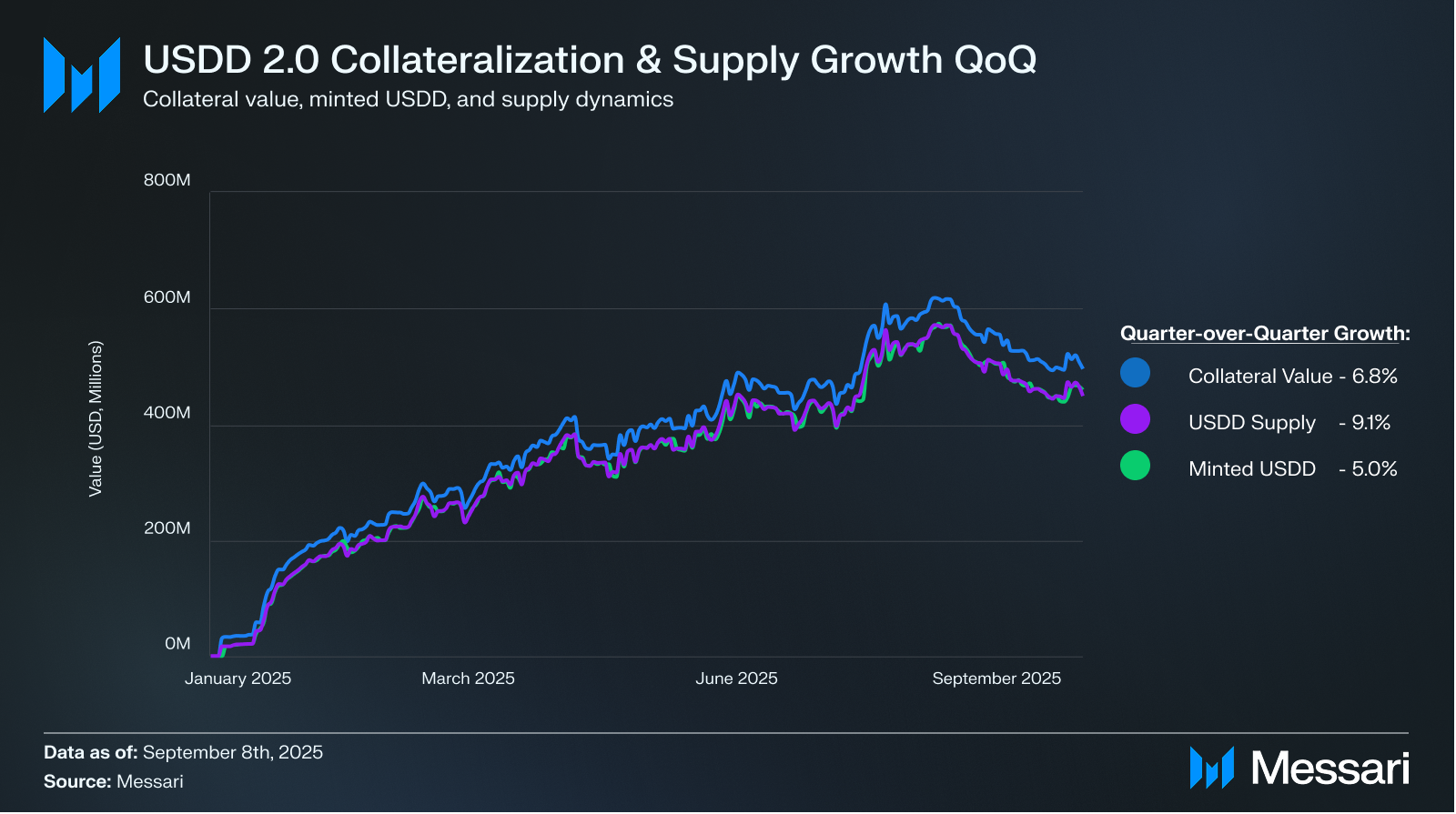 2025년 1월 재출시 이후, USDD 2.0 프로토콜은 일관되고 건강한 성장을 보여주며 최근 생태계 확장을 위한 안정적인 기반을 마련했다. 올해 첫 3분기 동안 USDD의 총 공급량과 이를 뒷받침하는 담보 모두 크게 확대되었으며, 총 담보 가치는 8월 초 6억 2천만 달러를 넘어섰다. 결정적으로, 프로토콜은 이 기간 내내 과담보화 상태를 유지했으며, 준비 자산의 총 가치는 USDD의 총 유통 공급량을 지속적으로 초과했다. 이러한 보안 증가 추세는 가장 최근의 분기 대비 데이터로 더욱 입증되는데, 담보 가치가 5% 증가한 반면 스테이블코인의 공급량은 3% 증가하여 멀티체인 배포를 앞두고 담보 비율이 강화되고 있음을 나타낸다.