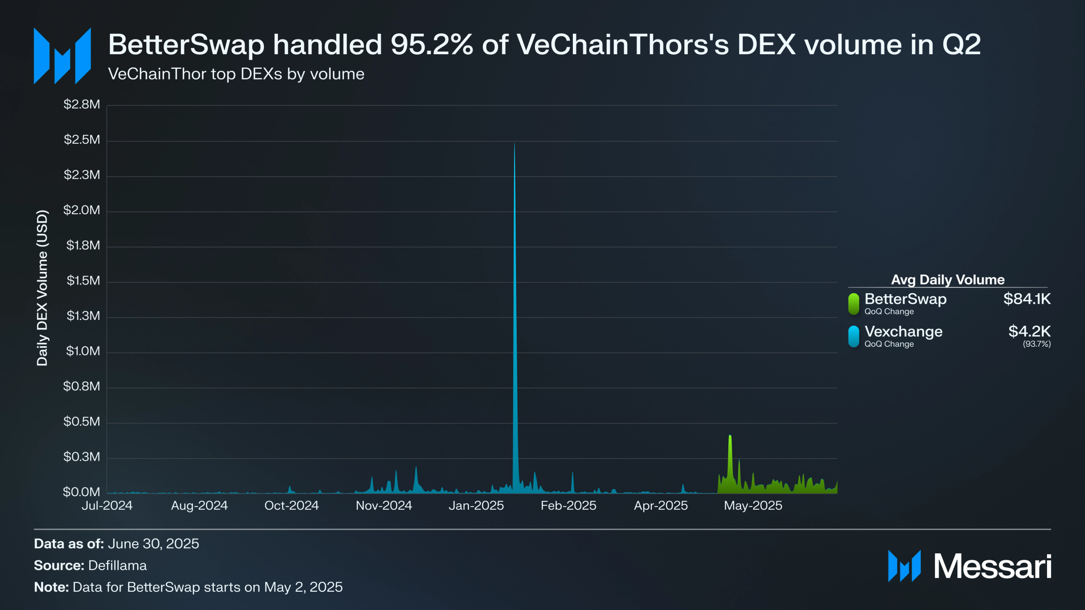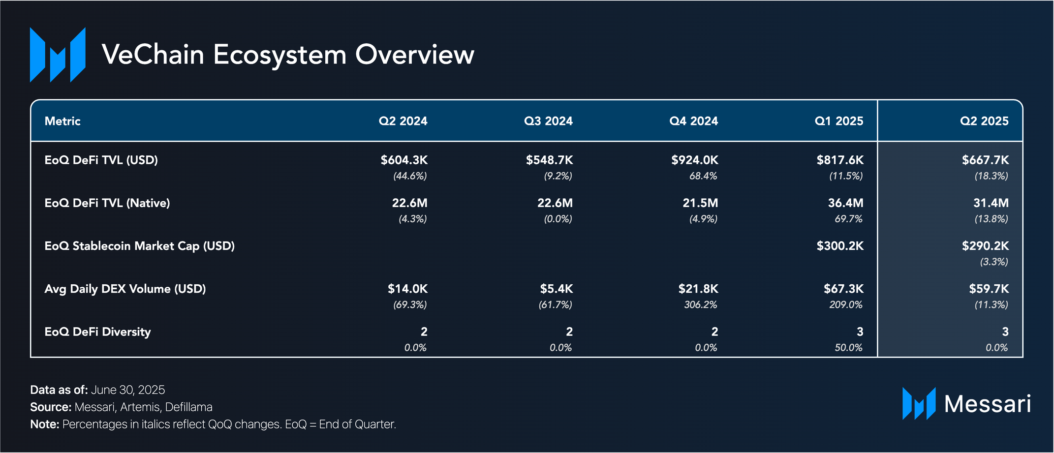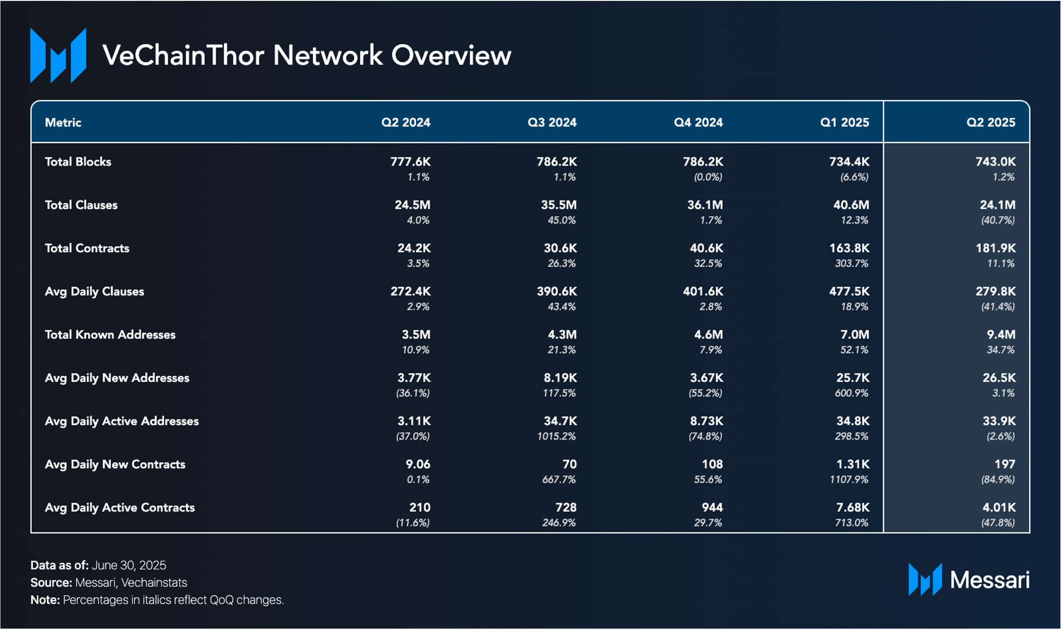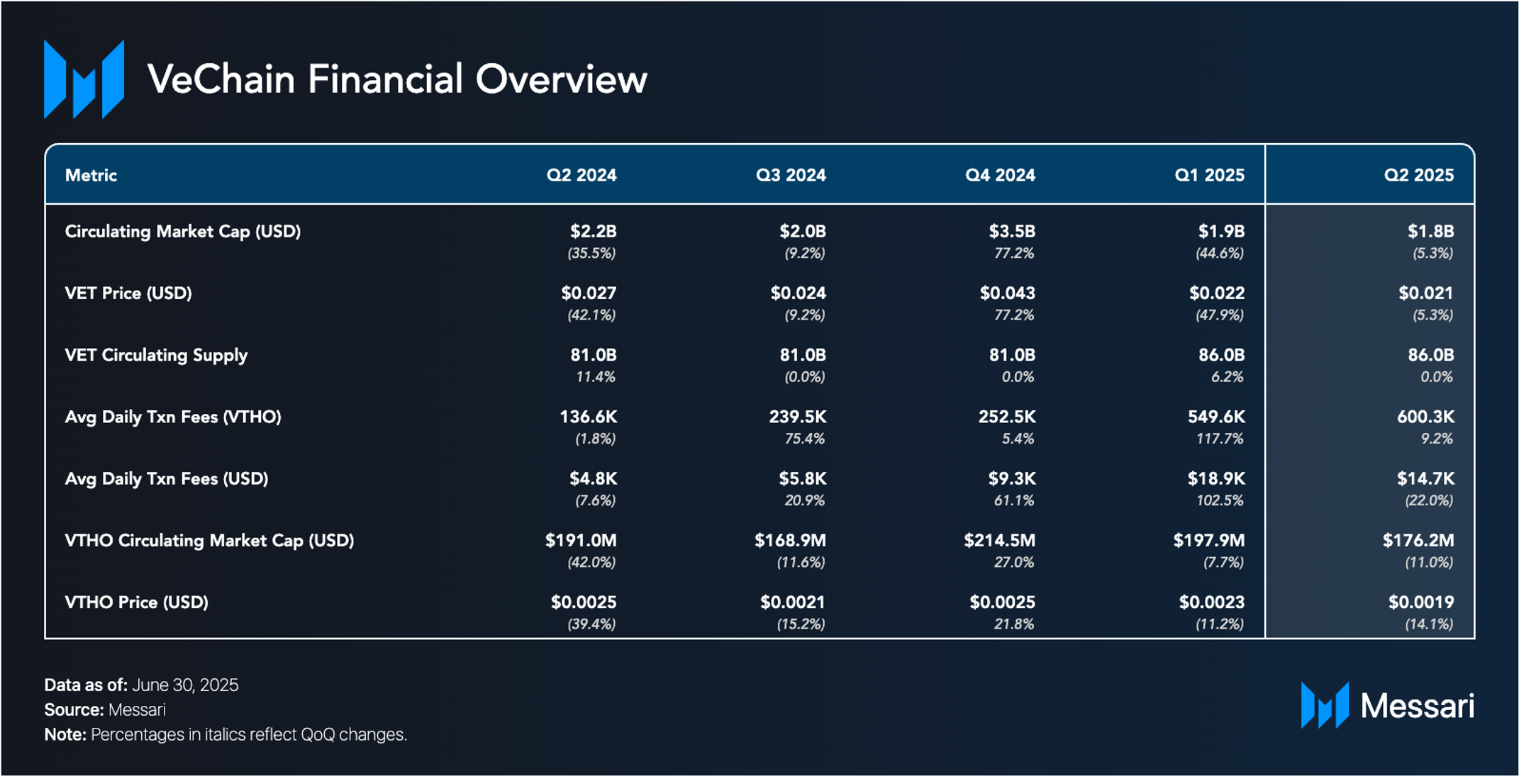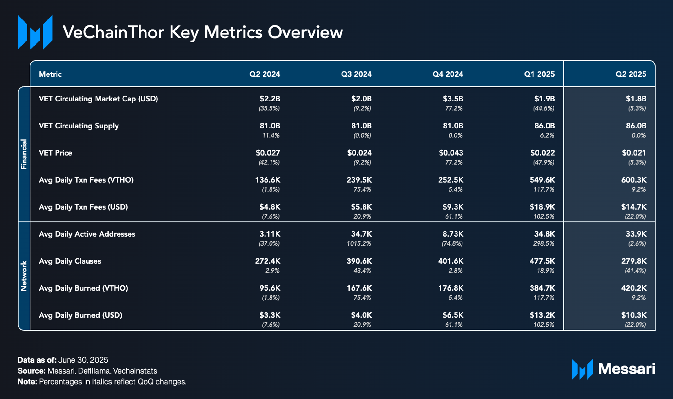 2025년 2분기는 비체인의 과도기였다. 시가총액, 수수료, 활동이 감소하며 2024년 말부터의 둔화가 계속되었다. 그럼에도 불구하고 분기는 주요 업그레이드를 위한 토대를 마련했다. 르네상스 업그레이드는 갈락티카와 스타게이트의 발표와 함께 진전되어 새로운 VTHO 토큰노믹스 모델, NFT 기반 스테이킹, 확장된 검증자 참여를 도입했다. 또한 발표된 완체인 통합은 비체인의 범위를 더욱 확대하여 40개 이상의 블록체인과 130개 자산에 연결했다.