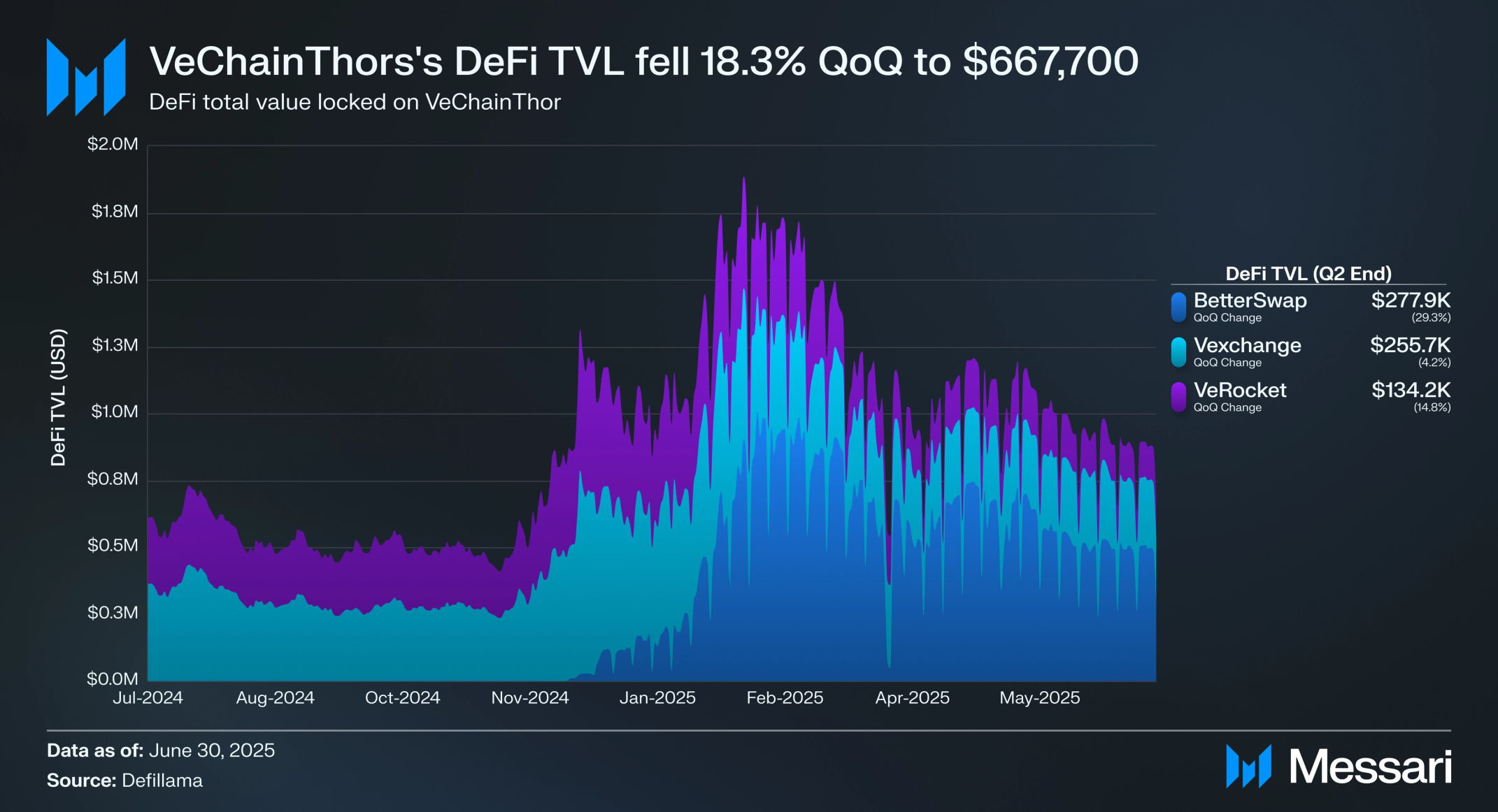 비체인토르의 디파이 생태계는 2025년 2분기에 위축되었으며, 총 예치 가치(TVL)는 전분기 대비 18.3% 감소하여 667,700 달러를 기록했다. 감소는 생태계 전반에 걸쳐 보편적이었으며, 베터스왑(BetterSwap)은 29.3% 감소하여 277,900 달러, 벡스체인지(Vexchange)는 4.2% 감소하여 255,700 달러, 브이로켓(VeRocket)은 14.8% 감소하여 134,200 달러를 기록했다.