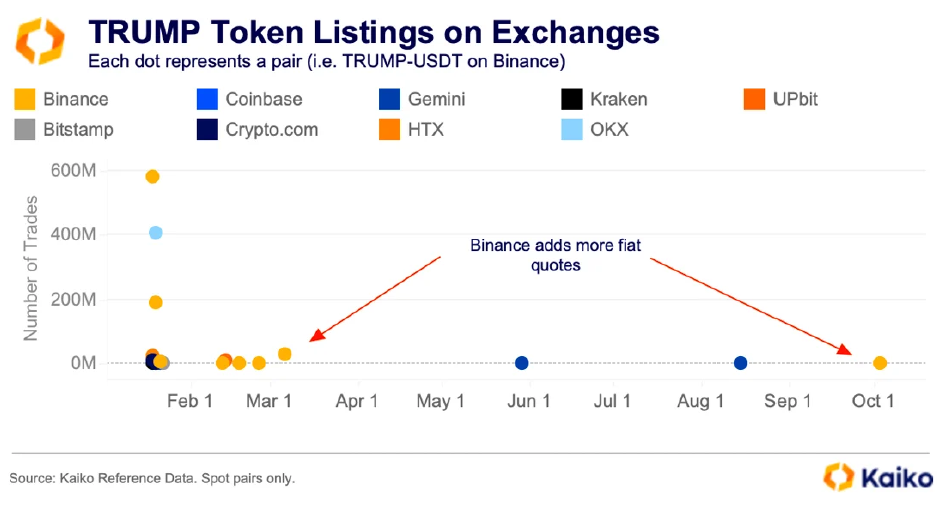 거래소 상장 데이터는 트럼프(TRUMP) 토큰의 과대 광고가 짧았음을 확인한다. 대부분의 초기 상장은 미국 달러 또는 주요 미국 달러 스테이블코인으로 이루어졌으며, 나중에 소수의 법정화폐 거래 쌍만 추가되었다. 상장 활동은 출시 시점에 집중되었으며, 이는 거래소들이 거래 쌍 확장에서 제한된 가치를 보고 시장 조성자들이 상당한 유동성을 공급하지 않고 있음을 나타낸다.